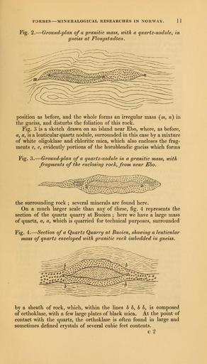 | Keywords: The Quarterly journal of the Geological Society of London (12711613785).jpg FORBES MINERALOGICAL RESEARCHES IN NORWAY <br> 11 <br> Fig 2 Ground-plan of a granitic mass with a quartz-nodule in <br> gneiss at Flougstadoen <br> position as before and the whole forms an irregular mass in n in <br> the gneiss and disturbs the foliation of this rock <br> Fig 3 is a sketch drawn on an island near Ebo where as before <br> a a is a lenticular quartz nodule surrounded in this case by a mixture <br> of white oligoklase and chloritic mica which also encloses the frag- <br> ments c c evidentlj' portions of the hornblendic gneiss which forms <br> Fig 3 Ground-plan of a quartz-nodule in a granitic mass with <br> fragments of the enclosing rock from near Ebo <br> the surrounding rock ; several minerals are found here <br> On a much larger scale than any of these fig 4 represents the <br> section of the quartz quarry at Buoien ; here we have a large mass <br> of quartz a a which is quarried for technical purposes surrounded <br> Fig 4 Section of a Quartz Quarry at Buoien showing a lenticular <br> mass of quartz enveloped with granitic rock imbedded in gneiss <br> by a sheath of rock which within the lines b b b b is composed <br> of orthoklase with a few large plates of black mica At the point of <br> contact with the quartz the orthoklase is often found in large and <br> sometimes defined crystals of several cubic feet contents <br> c 2 35615219 110213 51125 Page 11 Text v 11 http //www biodiversitylibrary org/page/35615219 1855 Geological Society of London Biodiversity Heritage Library The Quarterly journal of the Geological Society of London v 11 1855 Geology Periodicals Smithsonian Libraries bhl page 35615219 dc identifier http //biodiversitylibrary org/page/35615219 smithsonian libraries Information field Flickr posted date ISOdate 2014-02-23 Check categories 2015 August 26 CC-BY-2 0 BioDivLibrary https //flickr com/photos/61021753 N02/12711613785 2015-08-26 20 59 21 cc-by-2 0 PD-old-70-1923 The Quarterly journal of the Geological Society of London 1855 Photos uploaded from Flickr by FĂŚ using a script |