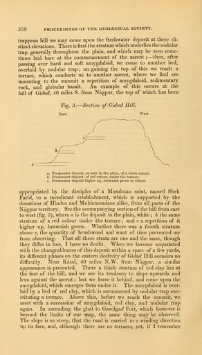 | Keywords: The Quarterly journal of the Geological Society of London (12711970924).jpg 358 PROCEEDINGS OF THE GEOLOGICAL SOCIETY <br> trappean hill we may come upon the freshwater deposit at three di- <br> stinct elevations There is first the stratum which underhes the nodular <br> trap generally throughout the plain and which may be seen some- <br> times laid bare at the commencement of the ascent ; ” then after <br> passing over hard and soft amygdaloid we come to another bed <br> overlaid by nodular trap ; on gaining the top of this we reach a <br> terrace which conducts us to another ascent where we find ere <br> mounting to the summit a repetition of amygdaloid sedimentary <br> rock and globular basalt An example of this occurs at the <br> hill of Gidsid 40 miles S from Nagpur the top of which has been <br> Fig 3 ” Section of Gidad Hill <br> East West <br> a Freshwater deposit as seen in the plain of a white colour <br> b Freshwater deposit of red colour under the terrace <br> c Freshwater deposit higher up brownish green in colour <br> appropriated by the disciples of a Musalman saint named Shek <br> Farid to a mendicant establishment which is supported by the <br> donations of Hindus and Muhammadans alike from all parts of the <br> Nagpur territory See the accompanying section of the hill from east <br> to west fig 3 where a is the deposit in the plain white ; b the same <br> stratum of a red colour under the terrace ; and c a repetition of it <br> higher up brownish green Whether there was a fourth stratum <br> above c the quantity of brushwood and want of time prevented me <br> from observing That all these strata are one and the same though <br> they differ in hue I have no doubt When we become acquainted <br> with the changeableness of this deposit within a space of a few yards <br> its different phases on the eastern declivity of Gidad Hill occasion no <br> difficulty Near Katol 40 miles N W from Nagpur a similar <br> appearance is presented There a thick stratum of red clay lies at <br> the foot of the hill and we see its tendency to slope upwards and <br> lean against the ascent ; but we leave it behind and come upon the <br> amygdaloid which emerges from under it The amygdaloid is over- <br> laid by a bed of red clay which is surmounted by nodular trap con- <br> stituting a terrace Above this before we reach the summit we <br> meet with a succession of amygdaloid red clay and nodular trap <br> again In ascending the ghat to GawilgaJ Fort which however is <br> beyond the limits of our map the same thing may be observed <br> The slope is so steep that the road is carried in a winding direction <br> up its face and although there are no terraces yet if I remember 35614946 110213 51125 Page 358 Text v 11 http //www biodiversitylibrary org/page/35614946 1855 Geological Society of London Biodiversity Heritage Library The Quarterly journal of the Geological Society of London v 11 1855 Geology Periodicals Smithsonian Libraries bhl page 35614946 dc identifier http //biodiversitylibrary org/page/35614946 smithsonian libraries Information field Flickr posted date ISOdate 2014-02-23 Check categories 2015 August 26 CC-BY-2 0 BioDivLibrary https //flickr com/photos/61021753 N02/12711970924 2015-08-26 20 58 56 cc-by-2 0 PD-old-70-1923 The Quarterly journal of the Geological Society of London 1855 Photos uploaded from Flickr by Fæ using a script |