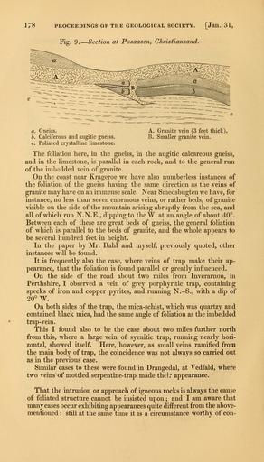 | Keywords: The Quarterly journal of the Geological Society of London (12711601973).jpg 178 PROCEEDINGS OF THE GEOLOGICAL SOCIETY Jan 31 <br> Fig 9 ” Section at Pusaasen Christiansand <br> i g gpg gp ipi <br> a Gneiss <br> b Calciferous and augitic gneiss <br> c Foliated crystalline limestone <br> A Granite vein 3 feet thick <br> B Smaller granite vein <br> The foliation here in the gneiss in the augitic calcareous gneiss <br> and in the limestone is parallel in each rock and to the general run <br> of the imbedded vein of granite <br> On the coast near Krageroe we have also numberless instances of <br> the foliation of the gneiss having the same direction as the veins of <br> granite may have on an immense scale Near Smedsbugten v\ e have for <br> instance no less than seven enormous veins or rather beds of granite <br> visible on the side of the mountain arising abruptly from the sea and <br> all of vvrhich run N N E dipping to the W at an angle of about 40° <br> Betv een each of these are great beds of gneiss the general foHation <br> of which is parallel to the beds of granite and the whole appears to <br> be several hundred feet in height <br> In the paper by Mr Dahl and myself previously quoted other <br> instances will be found <br> It is frequently also the case where veins of trap make their ap- <br> pearance that the foliation is found parallel or greatly influenced <br> On the side of the road about two miles from Inverarnon in <br> Perthshire I observed a vein of grey porphyritic trap containing <br> specks of iron and copper pyrites and running N -S with a dip of <br> 20° W <br> On both sides of the trap the mica-schist which was quartzy and <br> contained black mica had the same angle of foliation as the imbedded <br> trap-vein <br> This I found also to be the case about two miles further north <br> from this where a large vein of syenitic trap running nearly hori- <br> zontal showed itself Here however as small veins ramified from <br> the main body of trap the coincidence was not always so carried out <br> as in the previous case <br> Similar cases to these were found in Drangedal at Vedfald where <br> two veins of mottled serpentine-trap made their appearance <br> That the intrusion or approach of igneous rocks is always the cause <br> of foliated structure cannot be insisted upon ; and I am aware that <br> many cases occur exhibiting appearances quite diiferent from the above- <br> mentioned still at the same time it is a circumstance worthy of con- 35614750 110213 51125 Page 178 Text v 11 http //www biodiversitylibrary org/page/35614750 1855 Geological Society of London Biodiversity Heritage Library The Quarterly journal of the Geological Society of London v 11 1855 Geology Periodicals Smithsonian Libraries bhl page 35614750 dc identifier http //biodiversitylibrary org/page/35614750 smithsonian libraries Information field Flickr posted date ISOdate 2014-02-23 Check categories 2015 August 26 CC-BY-2 0 BioDivLibrary https //flickr com/photos/61021753 N02/12711601973 2015-08-26 20 55 16 cc-by-2 0 PD-old-70-1923 The Quarterly journal of the Geological Society of London 1855 Photos uploaded from Flickr by Fæ using a script |