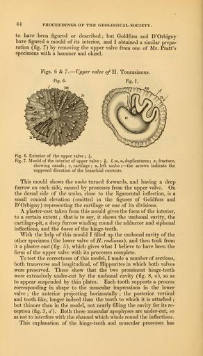 | Keywords: The Quarterly journal of the Geological Society of London (12711770344).jpg 44 <br> PROCEEDINGS OF THE GEOLOGICAL SOCIETY <br> to have been figured or described; but Goldfuss and D'Orbigny <br> have figured a mould of its interior and I obtained a similar prepa- <br> ration fig 7 by removing the upper valve from one of Mr Pratt's <br> specimens with a hammer and chisel <br> Figs 6 7 ” Upper valve ofH Toucasianus <br> Fig 7 <br> Fig 6 Exterior of the upper valve ; \ <br> Fig 7 Mould of the interior of upper valve ; f I m n duplicatures ; x fracture <br> showing canals ; c cartilage ; u left umbo ; ” the arrows indicate the <br> supposed direction of the branchial currents <br> This mould shows the umbo turned forwards and having a deep <br> furrow on each side caused by processes from the upper valve On <br> the dorsal side of the umbo close to the ligamental inflection is a <br> small conical elevation omitted in the figures of Goldfuss and <br> D'Orbigny representing the cartilage or one of its divisions <br> A plaster-cast taken from this mould gives the form of the interior <br> to a certain extent ; that is to say it shows the umbonal cavity the <br> cartilage-pit a deep furrow winding round the adductor and siphonal <br> inflections and the bases of the hinge-teeth <br> With the help of this mould I filled up the umbonal cavity of the <br> other specimen the lower valve of radiosus and then took from <br> it a plaster- cast fig 5 which gives what I believe to have been the <br> form of the upper valve with its processes complete <br> To test the correctness of this model I made a number of sections <br> both transverse and longitudinal of Hippurites in which both valves <br> were preserved These show that the two prominent hinge-teeth <br> were extensively under-cut by the umbonal cavity fig 8 u so as <br> to appear suspended by thin plates Each tooth supports a process <br> corresponding in shape to the muscular impressions in the lower <br> valve ; the anterior projecting horizontally ; the posterior vertical <br> and tooth-like longer indeed than the tooth to which it is attached ; <br> but thinner than in the model not nearly filling the cavity for its re- <br> ception fig 3 «' Both these muscular apophyses are under-cut so <br> as not to interfere with the channel which winds round the inflections <br> This explanation of the hinge-teeth and muscular processes has 35614604 110213 51125 Page 44 Text v 11 http //www biodiversitylibrary org/page/35614604 1855 Geological Society of London NameFound Hippurites NameConfirmed Hippurites EOLID 4773611 NameBankID 4195877 NameFound Toucasianus Biodiversity Heritage Library The Quarterly journal of the Geological Society of London v 11 1855 Geology Periodicals Smithsonian Libraries bhl page 35614604 dc identifier http //biodiversitylibrary org/page/35614604 smithsonian libraries Information field Flickr posted date ISOdate 2014-02-23 Check categories 2015 August 26 CC-BY-2 0 BioDivLibrary https //flickr com/photos/61021753 N02/12711770344 2015-08-26 20 58 07 cc-by-2 0 PD-old-70-1923 The Quarterly journal of the Geological Society of London 1855 Photos uploaded from Flickr by Fæ using a script |