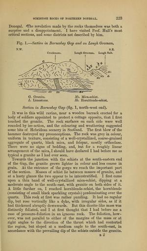 Keywords: The Quarterly journal of the Geological Society of London (14096462793).jpg SCHISTOSE ROCKS OF NORTHERN DONEGAL <br> 223 <br> Donegal 'The revelation made by the rocks themselves was both a <br> surprise and a disappointment I have visited Prof Hull's most <br> critical sections and some districts not described by him <br> Pig 1 ” Section in Bar <br> Gap and on Lough Greenan <br> S E <br> Lough G-reenan Lough Salt <br> I <br> I <br> G Granite <br> L Limestone <br> Ms Mica-scliist <br> Hs Hornblende-schist <br> Section in Barnesheg Gap fig 1 north-west end <br> It was in this wild ravine near a wooden barrack erected for a <br> body of soldiers appointed to protect a cottage opposite that I fi rst <br> touched the granite The rock surfaces on each side were well <br> rounded by ice-action and the colouring and weathering suggested <br> some bits of Hebridean scenery in Scotland The first blow of the <br> hammer destroyed my preconceptions The rock was grey in colour <br> uniform in texture consisting of a well-crystallized coarse-grained <br> aggregate of quartz black mica and felspar mostly orthoclase <br> There were no signs of bedding and but for a roughly linear <br> arrangement of the mica I should have declared I had before me as <br> typical a granite as I had ever seen <br> Towards the junction with the schists at the south-eastern end <br> of the Gap the granite grows lighter in colour and less coarse in <br> grain At the entrance of the gorge we reach the important part <br> of the section Masses of schist lie between masses of granite and <br> at a hasty glance the two appear to be interstratified I first came <br> upon a thin band of well-crystallized mica-schist dipping at a <br> moderate angle to the south-east with granite on both sides of it <br> A little further on I reached hornblende-schist the hornblende <br> consisting of small black sparkling crystals predominating over the <br> quartz This rock at first was rather puzzling It had no regular <br> dip but rose vertically like a dyke with irregular sides as if it <br> had thickened abruptly downwards But this diorite-like mass was <br> distinctly foliated and I at first thought that I had before me a <br> case of pressure-foliation in an igneous rock The foliation how- <br> ever was not parallel to either of the margins of the mass or at <br> right angles to the direction of the thrust which had contorted <br> the region but sloped at a medium angle to the south-east in <br> accordance with the prevailing dip of the schists outside the granite <br> r2 37047075 114009 51125 Page 223 Text 41 http //www biodiversitylibrary org/page/37047075 1885 Geological Society of London Biodiversity Heritage Library The Quarterly journal of the Geological Society of London v 41 1885 Geology Periodicals Smithsonian Libraries bhl page 37047075 dc identifier http //biodiversitylibrary org/page/37047075 smithsonian libraries Information field Flickr posted date ISOdate 2014-04-30 Check categories 2015 August 26 CC-BY-2 0 BioDivLibrary https //flickr com/photos/61021753 N02/14096462793 2015-08-26 04 51 54 cc-by-2 0 PD-old-70-1923 The Quarterly journal of the Geological Society of London 1885 Photos uploaded from Flickr by Fæ using a script |