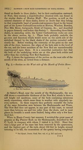| Keywords: The Quarterly journal of the Geological Society of London (12684836304).jpg 1852 DAWSON NEW RED SANDSTONE OF NOVA SCOTIA 399 <br> found no fossils in these shales ; but in their continuation eastward <br> at Noel they contain a Lepidodendron identical with one found in <br> the similar shales of Horton Bluff The position as well as the <br> mineral character of these shales leaves no doubt that they belong <br> to that remarkable band of pseudo-coal-measures found in the lowest <br> part of the Lower Carboniferous series at Horton Windsor Rawdon <br> Five Mile River Antigonish Strait of Canseau c and described <br> in papers formerly read before this Society Succeeding these black <br> shales in ascending order the Lower Carboniferous rocks are seen <br> in the above section fig 1 These beds probably underlie the <br> gypsum and limestone which would recur on the north side of the <br> anticlinal formed by the black shales if the section extended suffi- <br> ciently far Before reaching the extremity of the point on the east <br> side of the river however the edges of the beds sink to the level of <br> the sea and the lower members of the New Red are unconformably <br> superimposed upon them It is a somewhat instructive fact that <br> the beds of the underlying series are at this place both redder and <br> softer than the overlying New Red Sandstone <br> Fig 2 shows the appearance of the section on the west side of the <br> mouth of the river as viewed from a distance <br> Fig 2 Section on the West side of the Mouth of Petite River <br> a New Red Sandstone b Carboniferous strata <br> At Salter's Head near the mouth of the Shubenacadie the sea- <br> cUff shows a considerable thickness of the New Red which is there a <br> soft bright red sandstone some of the beds containing calcareous <br> sandy concretions which cause them to weather with singularly un- <br> even surfaces In these respects they perfectly resemble the rocks <br> of the same formation seen between the Shubenacadie and Truro <br> The New Red does not appear in any part of this coast to extend <br> more than between one and two miles from the shore and in most <br> places its breadth is much more limited being often only a ies hun- <br> dred feet <br> When in Hants County last summer I revisited the great mass of <br> gypsum at Big Plaister Rock on the Shubenacadie described by Sir <br> C Lyell in company with whom I visited it in 1842 Since that <br> time a large part of the mass has been removed by the quarrymen <br> and the highest part of the rock about 100 feet in height seemed <br> tottering to its fall the excavations of the quarry having completely <br> See Quart Journ Geol Soc vol vi p 347 and note <br> 2 D 2 35461469 109911 51125 Page 399 Text v 8 http //www biodiversitylibrary org/page/35461469 1852 Geological Society of London NameFound Lepidodendron NameConfirmed Lepidodendron EOLID 13132167 NameBankID 4921583 Biodiversity Heritage Library The Quarterly journal of the Geological Society of London v 8 1852 Geology Periodicals Smithsonian Libraries bhl page 35461469 dc identifier http //biodiversitylibrary org/page/35461469 smithsonian libraries Information field Flickr posted date ISOdate 2014-02-21 Check categories 2015 August 26 CC-BY-2 0 BioDivLibrary https //flickr com/photos/61021753 N02/12684836304 2015-08-26 20 55 13 cc-by-2 0 PD-old-70-1923 The Quarterly journal of the Geological Society of London 1852 Photos uploaded from Flickr by FĂŚ using a script |