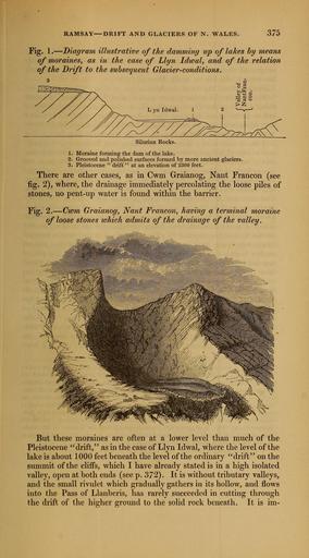 Keywords: The Quarterly journal of the Geological Society of London (12684806254).jpg RAMSAY DRIFT AND GLACIERS OF N WALES <br> 375 <br> Fig 1 Diagram illustrative of the damming up of lakes by means <br> of moraines as in the case of Llyn Idwal and of the relation <br> of the Drift to the subsequent Glacier-conditions <br> ˘ S <br> Silurian Rocks <br> 1 Moraine forming the dam of the lake <br> 2 Grooved and polished surfaces formed by more ancient glaciers <br> 3 Pleistocene drift at an elevation of 2300 feet <br> There are other cases as in Cwm Graianog Nant Francon see <br> fig 2 where the drainage immediately percolating the loose piles of <br> stones no pent-up water is found within the barrier <br> Fig 2 Cwm Graianog Nant Francon having a terminal moraine <br> of loose stones which admits of the drainage of the valley <br> But these moraines are often at a lower level than much of the <br> Pleistocene drift as in the case of Llyn Idwal where the level of the <br> lake is about 1000 feet beneath the level of the ordinary drift on the <br> summit of the cliffs which I have already stated is in a high isolated <br> valley open at both ends see p 372 It is without tributary valleys <br> and the small rivulet which gradually gathers in its hollow and flows <br> into the Pass of Llanberis has rarely succeeded in cutting through <br> the drift of the higher ground to the solid rock beneath It is im- 35461443 109911 51125 Page 375 Text v 8 http //www biodiversitylibrary org/page/35461443 1852 Geological Society of London Biodiversity Heritage Library The Quarterly journal of the Geological Society of London v 8 1852 Geology Periodicals Smithsonian Libraries bhl page 35461443 dc identifier http //biodiversitylibrary org/page/35461443 smithsonian libraries Information field Flickr posted date ISOdate 2014-02-21 Check categories 2015 August 26 CC-BY-2 0 BioDivLibrary https //flickr com/photos/61021753 N02/12684806254 2015-08-27 12 53 53 cc-by-2 0 PD-old-70-1923 The Quarterly journal of the Geological Society of London 1852 Photos uploaded from Flickr by FĂŚ using a script |