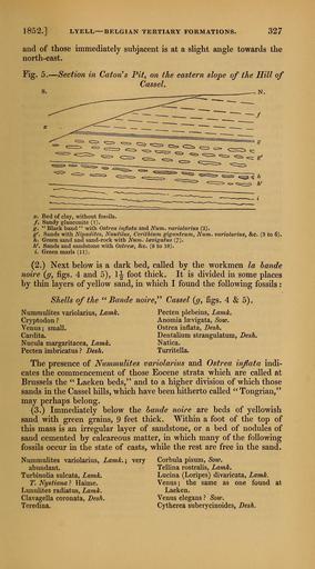 | Keywords: The Quarterly journal of the Geological Society of London (12684759984).jpg  1852 <br> LYELL BELGIAN TERTIARY FORMATIONS <br> 327 <br> and of those immediately subjacent is at a slight angle towards the <br> north-east <br> Fig 5 ” Section in Caton's Pit on the eastern slope of the Hill of <br> Cassel <br> S ___- N <br> » Bed of clay without fossils <br> / Sandy glauconite 1 <br> g Black band with Ostrea inflata and Num tmriolarius 2 <br> g' Sands with Nipadites Nautilus Cerithium giganteum Num variolarius c 3 to 6 <br> h Green sand and sand-rock with Num Icevigatus 7 <br> h' Sands and sandstone with Ostrece c 8 to 10 <br> i Green naarls 11 <br> 2 Next below is a dark bed called by the workmen la hande <br> noire g figs 4 and 5 1 foot thick It is divided in some places <br> by thin layers of yellow sand in which I found the following fossils <br> Shells of the Bande noire Cassel ff figs 4 5 <br> Numraulites variolarius Lamh <br> Cryptodon <br> Venus; small <br> Cardita <br> Nucula margaritacea Lamk <br> Pecten imbricatus – ' Besh <br> Pecten plebeius Lamk <br> Anomia laevigata Sow <br> Ostrea inflata Besh <br> Dentalium strangulatum BesJi <br> Natica <br> Turritella <br> The presence of Nummulites variolarius and Ostrea inflata indi- <br> cates the commencement of those Eocene strata which are called at <br> Brussels the Laeken beds/' and to a higher division of which those <br> sands in the Cassel hills which have been hitherto called Tongrian <br> may perhaps belong <br> 3 Immediately below the hande noire are beds of yellowish <br> sand with green grains 9 feet thick Within a foot of the top of <br> this mass is an irregular layer of sandstone or a bed of nodules of <br> sand cemented by calcareous matter in which many of the following <br> fossils occur in the state of casts while the rest are free in the sand <br> Nummulites variolarius Lamk \ very <br> abundant <br> Turbinolia sulcata Lamk <br> T Nystiana Haime <br> Lunulites radiatus Lamk <br> Clavagella coronata Besh <br> Teredina <br> Corbula pisum Sow <br> Tellina rostralis Lamk <br> Lucina Loripes divaricata Lamk <br> Venus; the same as one found at <br> Laeken <br> Venus elegans Sow <br> Cytherea suberycinoides Besh 35461381 109911 51125 Page 327 Text v 8 http //www biodiversitylibrary org/page/35461381 1852 Geological Society of London NameFound Anomia laevigata NameConfirmed Anomia laevigata NameBankID 6996000 NameFound Cardita NameConfirmed Cardita EOLID 57589 NameBankID 2693146 NameFound Cerithium giganteum NameConfirmed Cerithium giganteum NameFound Clavagella coronata NameConfirmed Clavagella coronata NameBankID 6900716 NameFound Corbula pisum NameConfirmed Corbula pisum J Sowerby 1818 NameFound Cryptodon NameConfirmed Cryptodon EOLID 4766763 NameBankID 2798147 NameFound Cytherea suberycinoides NameConfirmed Cytherea suberycinoides NameBankID 7047761 NameFound Dentalium strangulatum NameFound Icevigatus NameFound Lucina Loripes divaricata NameConfirmed Lucina divaricata Lamarck NameFound Lunulites radiatus NameConfirmed Lunulites radiatus Defrance NameFound Natica NameConfirmed Natica EOLID 58662 NameBankID 2684906 NameFound Nipadites NameConfirmed Nipadites NameBankID 4859492 NameFound Nucula margaritacea NameConfirmed Nucula margaritacea Lamarck 1805 NameFound Nummulites variolarius NameConfirmed Nummulites variolarius EOLID 6817804 NameBankID 6755613 NameFound Numraulites variolarius NameConfirmed Nummulites variolarius EOLID 6817804 NameBankID 6755613 NameFound Ostrea inflata NameConfirmed Ostrea inflata Deshayes NameFound Ostrea inflata indi cates NameConfirmed Ostrea inflata Deshayes NameFound Pecten imbricatus NameConfirmed Pecten imbricatus Deshayes NameFound Pecten plebeius NameConfirmed Pecten plebeius J de C Sowerby 1850 NameFound Tellina rostralis NameConfirmed Tellina rostralis Lamarck 1806 NameFound Teredina NameConfirmed Teredina NameBankID 4365222 NameFound Turbinolia sulcata NameConfirmed Turbinolia sulcata Lamarck 1816 EOLID 4687189 NameFound Turritella NameConfirmed Turritella EOLID 52187 NameBankID 2683895 NameFound Venus elegans NameConfirmed Venus elegans Wood 1828 Biodiversity Heritage Library The Quarterly journal of the Geological Society of London v 8 1852 Geology Periodicals Smithsonian Libraries bhl page 35461381 dc identifier http //biodiversitylibrary org/page/35461381 smithsonian libraries Information field Flickr posted date ISOdate 2014-02-21 Check categories 2015 August 26 CC-BY-2 0 BioDivLibrary https //flickr com/photos/61021753 N02/12684759984 2015-08-27 12 59 18 cc-by-2 0 PD-old-70-1923 The Quarterly journal of the Geological Society of London 1852 Photos uploaded from Flickr by Fæ using a script |