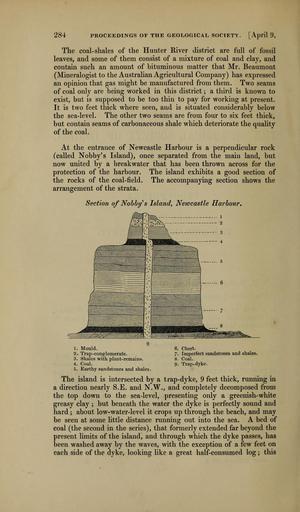 | Keywords: The Quarterly journal of the Geological Society of London (12683215835).jpg 284 <br> PROCEEDINGS OF THE GEOLOGICAL SOCIETY April 9 <br> The coal- shales of the Hunter River district are full of fossil <br> leaves and some of them consist of a mixture of coal and clay and <br> contam such an amount of hituminous matter that Mr Beaumont <br> Mineralogist to the Australian Agricultural Company has expressed <br> an opinion that gas might be manufactured from them Two seams <br> of coal only are being worked in this district ; a third is known to <br> exist but is supposed to be too thin to pay for working at present <br> It is two feet thick where seen and is situated considerably below <br> the sea-level The other two seams are from four to six feet thick <br> but contain seams of carbonaceous shale which deteriorate the quality <br> of the coal <br> At the entrance of Newcastle Harbour is a perpendicular rock <br> called Nobby' s Island once separated from the main land but <br> now united by a breakwater that has been thrown across for the <br> protection of the harbour The island exhibits a good section of <br> the rocks of the coal-field The accompanying section shows the <br> arrangement of the strata <br> Section of Nobby s Island Newcastle Harbour <br> 1 Mould <br> 2 Trap-conglomerate <br> 3 Shales with plant-remains <br> 4 Coal <br> 5 Earthy sandstones and shales <br> 6 Chert <br> 7 Imperfect sandstones and shales <br> 8 Coal <br> 9 Trap-dyke <br> The island is intersected by a trap-dyke 9 feet thick running in <br> a direction nearly S E and N W and completely decomposed from <br> the top down to the sea-level presenting only a greenish-white <br> greasy clay ; but beneath the water the dyke is perfectly sound and <br> hard ; about low-water-level it crops up through the beach and may <br> be seen at some little distance running out into the sea A bed of <br> coal the second in the series that formerly extended far beyond the <br> present limits of the island and through which the dyke passes has <br> been washed away by the waves with the exception of a few feet on <br> each side of the dyke looking like a great half-consumed log ; this 35338737 109655 51125 Page 284 Text v 12 http //www biodiversitylibrary org/page/35338737 1856 Geological Society of London NameFound Shales Biodiversity Heritage Library The Quarterly journal of the Geological Society of London v 12 1856 Geology Periodicals Smithsonian Libraries bhl page 35338737 dc identifier http //biodiversitylibrary org/page/35338737 smithsonian libraries Information field Flickr posted date ISOdate 2014-02-21 Check categories 2015 August 26 CC-BY-2 0 BioDivLibrary https //flickr com/photos/61021753 N02/12683215835 2015-08-27 11 59 01 cc-by-2 0 PD-old-70-1923 The Quarterly journal of the Geological Society of London 1856 Photos uploaded from Flickr by Fæ using a script |
