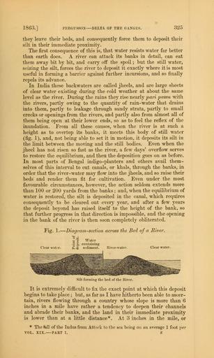 Keywords: The Quarterly journal of the Geological Society of London (12645922603).jpg 1863 <br> FERGUSSOX DELTA OP THE GAXGF S <br> 32 <br> they leave their beds and consequently force them to deposit their <br> silt in their immediate proximity <br> The first consequence of this is that water resists water far better <br> than earth does A river can attack its banks in detail can eat <br> them away bit by bit and carry off the spoil ; but the still water <br> seizing the silt forces the river to deposit it exactly where it is most <br> useful in forming a barrier against further incursions and so finally <br> repels its advance <br> In India these backwaters are called j heels and are large sheets <br> of clear water existing during the cold weather at about the same <br> level as the river During the rains they rise nearly pari passu with <br> the rivers partly owing to the quantity of rain-water that drains <br> into them partly to leakage through sandy strata partly to small <br> creeks or openings from the rivers and partly also from almost all of <br> them being open at their lower ends so as to feel the reflex of the <br> inundation From all these causes when the river is at such a <br> height as to overtop its banks it meets this body of still water <br> fig 1 and not being able to set it in motion it deposits its silt in <br> the limit between the moving and the still bodies Even when the <br> jheel has not risen so fast as the river a few days' overflow serves <br> to restore the equilibrium and then the deposition goes on as before <br> In most parts of Bengal indigo -planters and others avail them- <br> selves of this interval to cut canals or khals through the banks in <br> order that the river-water may flow into the jheels and so raise their <br> beds and render them fit for cultivation Even under the most <br> favourable circumstances however the action seldom extends more <br> than 100 or 200 yards from the banks ; and when the equilibrium of <br> water is restored the silt is deposited in the canal which requires <br> consequently to be cleared out every year and after a few years <br> the deposit beyond has raised itself to the height of the bank so <br> that further progress in that direction is impossible and the opening <br> in the bank of the river is then soon completely obliterated <br> Fig 1 ” Diagram-section across the Bed of a River <br> Clear water <br> – w '35 Water <br> 5 a containing <br> p sediment River-Water <br> Clear water <br> Silt forming the bed of the River <br> It is extremely difficult to fix the exact point at which this deposit <br> begins to take place ; but as far as I have hitherto been able to ascer- <br> tain rivers flowing through a country whose slope is more than 6 <br> inches in a mile have rather a tendency to deepen their channels <br> and abrade their banks and the land in their immediate proximity <br> is lower than at a little distance At 3 inches in the mile or <br> The fell of the Indus from Attoek to the sea being on an average 1 foot per <br> VOL XIX PART I Z 35328296 109632 51125 Page 325 Text v 19 http //www biodiversitylibrary org/page/35328296 1863 Geological Society of London Biodiversity Heritage Library The Quarterly journal of the Geological Society of London v 19 1863 Geology Periodicals Smithsonian Libraries bhl page 35328296 dc identifier http //biodiversitylibrary org/page/35328296 smithsonian libraries Information field Flickr posted date ISOdate 2014-02-20 Check categories 2015 August 26 CC-BY-2 0 BioDivLibrary https //flickr com/photos/61021753 N02/12645922603 2015-08-27 11 52 41 cc-by-2 0 PD-old-70-1923 The Quarterly journal of the Geological Society of London 1863 Photos uploaded from Flickr by Fæ using a script |
