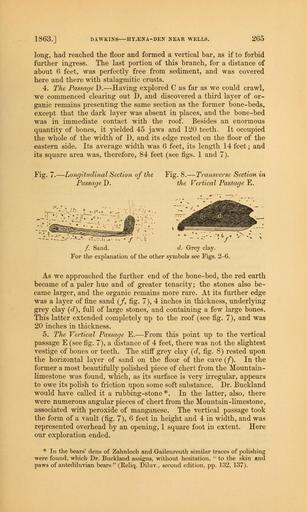 | Keywords: The Quarterly journal of the Geological Society of London (12645765045).jpg 1863 <br> DAWKINS HY ENA-DEN NEAR WELLS <br> 265 <br> long had reached the floor and formed a vertical bar as if to forbid <br> further ingress The last portion of this branch for a distance of <br> about 6 feet was perfectly free from sediment and was covered <br> here and there with stalagmitic crusts <br> 4 The Passage D Having explored C as far as we could crawl <br> we commenced clearing out D and discovered a third layer of or- <br> ganic remains presenting the same section as the former bone -beds <br> except that the dark layer was absent in places and the bone-bed <br> was in immediate contact with the roof Besides an enormous <br> quantity of bones it yielded 45 jaws and 120 teeth It occupied <br> the whole of the width of D and its edge rested on the floor of the <br> eastern side Its average width w r as 6 feet its length 14 feet ; and <br> its square area was therefore 84 feet see figs 1 and 7 <br> Fig 7 Longitudinal Section of the Fig 8 Transverse Section in <br> Passage D the Vertical Passage E <br> / Sand d Grey clay <br> For the explanation of the other symbols see Figs 2-6 <br> As we approached the further end of the bone-bed the red earth <br> became of a paler hue and of greater tenacity; the stones also be- <br> came larger and the organic remains more rare At its further edge <br> was a layer of fine sand / fig 7 4 inches in thickness underlying <br> grey clay d full of large stones ' and containing a few large bones <br> This latter extended completely up to the roof see fig 7 and was <br> 20 inches in thickness <br> 5 The Vertical Passage E From this point up to the vertical <br> passage E see fig 7 a distance of 4 feet there was not the slightest <br> vestige of bones or teeth The stiff grey clay d fig 8 rested upon <br> the horizontal layer of sand on the floor of the cave f In the <br> former a most beautifully polished piece of chert from the Mountain- <br> limestone was found which as its surface is very irregular appears <br> to owe its polish to friction upon some soft substance Dr Buckland <br> would have called it a rubbing-stone In the latter also there <br> were numerous angular pieces of chert from the Mountain -limestone <br> associated with peroxide of manganese The vertical passage took <br> the form of a vault fig 7 6 feet in height and 4 in width and was <br> represented overhead by an opening 1 square foot in extent Here <br> our exploration ended <br> In the bears' dens of Zahnloch and G-ailenreuth similar traces of polishing <br> were found which Dr Buckland assigns without hesitation to the skin and <br> paws of antediluvian bears Reliq Diluv second edition pp 132 137 35328230 109632 51125 Page 265 Text v 19 http //www biodiversitylibrary org/page/35328230 1863 Geological Society of London Biodiversity Heritage Library The Quarterly journal of the Geological Society of London v 19 1863 Geology Periodicals Smithsonian Libraries bhl page 35328230 dc identifier http //biodiversitylibrary org/page/35328230 smithsonian libraries Information field Flickr posted date ISOdate 2014-02-20 Check categories 2015 August 26 CC-BY-2 0 BioDivLibrary https //flickr com/photos/61021753 N02/12645765045 2015-08-27 11 00 05 cc-by-2 0 PD-old-70-1923 The Quarterly journal of the Geological Society of London 1863 Photos uploaded from Flickr by FĂŚ using a script |