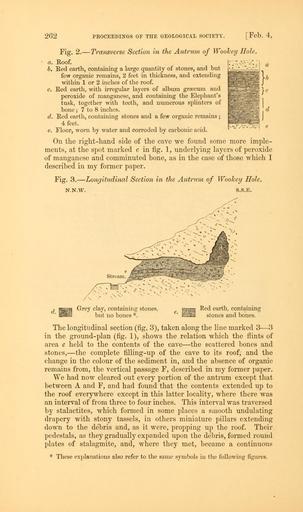 | Keywords: The Quarterly journal of the Geological Society of London (12645757155).jpg 2G2 <br> PROCEEDINGS OF THE GEOLOGICAL SOCIETY <br> Feb 4 <br> <br> Fig 2 Transverse Section in the Antrum of Woohey Hole <br> a Roof <br> b Red earth containing a large quantity of stones and but <br> few organic remains 2 feet in thickness and extending <br> within 1 or 2 inches of the roof <br> c Red earth with irregular layers of album grsecuni and <br> peroxide of manganese and containing the Elephant's <br> tusk together with teeth and numerous splinters of <br> bone ; 7 to 8 inches <br> d Red earth containing stones and a few organic remains ; <br> 4 feet <br> e Floor woi n by water and corroded by carbonic acid <br> On the right-hand side of the cave we found some more imple- <br> ments at the spot marked c in fig 1 underlying layers of peroxide <br> of manganese and comminuted bone as in the case of those which I <br> described in my former paper <br> Fig 3 Longitudinal Section in the Antrum of Woohey Hole <br> N N W S S E <br> - - o <br> _-_ - <br> ยป ยป~ N J <br> 5; i i 1 <br> ' <br> wsgt a <br> j ~-- <br> - ' - <br> Bjl <br> ' rt- <br> i- <br> r-- - <br> <br> 'SA--_ _ -- <br> - ' L / r - <br> -- J <br> d <br> Grey clay containing stones <br> but no bones <br> Red earth containing <br> stones and bones <br> The longitudinal section fig 3 taken along the line marked 3 3 <br> in the ground-plan fig 1 shows the relation which the flints of <br> area c held to the contents of the cave the scattered bones and <br> stones the complete filling-up of the cave to its roof and the <br> change in the colour of the sediment in and the absence of organic <br> remains from the vertical passage F described in my former paper <br> We had now cleared out every portion of the antrum except that <br> between A and F and had found that the contents extended up to <br> the roof everywhere except in this latter localit ' where there was <br> an interval of from three to four inches This interval was traversed <br> by stalactites which formed in some places a smooth undulating- <br> drapery with stony tassels in others miniature pillars extending <br> down to the debris and as it were propping up the roof Their <br> pedestals as they gradually expanded upon the debris formed round <br> plates of stalagmite and where they met became a continuous <br> These explanations also refer to the same symbols in the following figures 35328227 109632 51125 Page 262 Text v 19 http //www biodiversitylibrary org/page/35328227 1863 Geological Society of London Biodiversity Heritage Library The Quarterly journal of the Geological Society of London v 19 1863 Geology Periodicals Smithsonian Libraries bhl page 35328227 dc identifier http //biodiversitylibrary org/page/35328227 smithsonian libraries Information field Flickr posted date ISOdate 2014-02-20 Check categories 2015 August 26 CC-BY-2 0 BioDivLibrary https //flickr com/photos/61021753 N02/12645757155 2015-08-27 10 56 51 cc-by-2 0 PD-old-70-1923 The Quarterly journal of the Geological Society of London 1863 Photos uploaded from Flickr by Fรฆ using a script |