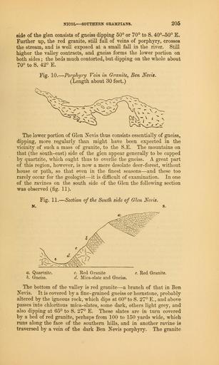 | Keywords: The Quarterly journal of the Geological Society of London (12646220864).jpg NICOL SOUTHERN GEAMPIANS <br> 205 <br> side of the glen consists of gneiss dipping 50° or 70° to S 40°-50° E <br> Further up the red granite still full of veins of porphyry crosses <br> the stream and is well exposed at a small fall in the river Still <br> higher the valley contracts and gneiss forms the lower portion on <br> both sides ; the beds much contorted but dipping on the whole about <br> 70° to S 42° E <br> Fig 10 ” Porphyry Vein in Granite Ben Nevis <br> Length about 30 feet <br> The lower portion of Glen Nevis thus consists essentially of gneiss <br> dipping more regularly than might have been expected in the <br> vicinity of such a mass of granite to the S E The mountains on <br> that the south-east side of the glen appear generally to be capped <br> by quartzite which ought thus to overlie the gneiss A great part <br> of this region however is now a mere desolate deer-forest without <br> house or path so that even in the finest seasons ” and these too <br> rarely occur for the geologist ” it is difficult of examination In one <br> of the ravines on the south side of the Glen the following section <br> was observed fig 11 <br> Fig 11 - <br> -Section of the South side of Glen Nevis <br> N <br> a Quartzite <br> b Gneiss <br> c Red Granite <br> d Mica-slate and Gneiss <br> e Red Granite <br> The bottom of the valley is red granite ” a branch of that in Ben <br> Nevis It is covered by a fine-grained gneiss or hornstone probably <br> altered by the igneous rock which dips at 60° to S 27° E and above <br> passes into chloritous mica-slates some dark others light grey and <br> also dipping at 65° to S 27° E These slates are in turn covered <br> by a bed of red granite perhaps from 100 to 150 yards wide which <br> runs along the face of the southern hills and in another ravine is <br> traversed by a vein of the dark Ben Nevis porphyry The granite 35328166 109632 51125 Page 205 Text v 19 http //www biodiversitylibrary org/page/35328166 1863 Geological Society of London Biodiversity Heritage Library The Quarterly journal of the Geological Society of London v 19 1863 Geology Periodicals Smithsonian Libraries bhl page 35328166 dc identifier http //biodiversitylibrary org/page/35328166 smithsonian libraries Information field Flickr posted date ISOdate 2014-02-20 Check categories 2015 August 26 CC-BY-2 0 BioDivLibrary https //flickr com/photos/61021753 N02/12646220864 2015-08-27 11 59 45 cc-by-2 0 PD-old-70-1923 The Quarterly journal of the Geological Society of London 1863 Photos uploaded from Flickr by Fæ using a script |
