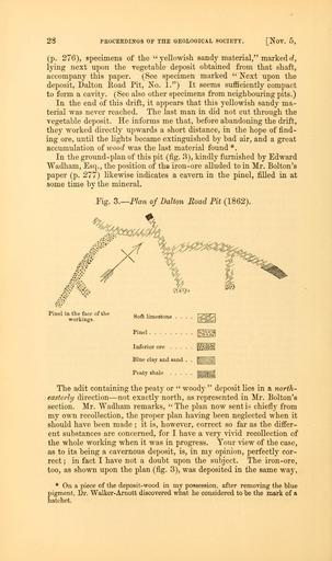 Keywords: The Quarterly journal of the Geological Society of London (12645777643).jpg 28 <br> PROCEEDINGS OF THE GEOLOGICAL SOCIETY Nov 5 <br> p 276 specimens of the yellowish sandy material marked d <br> lying next upon the vegetable deposit obtained from that shaft <br> accompany this paper See specimen marked Next upon the <br> deposit Dalton Road Pit No 1 It seems sufficiently compact <br> to form a cavity See also other specimens from neighbouring pits <br> In the end of this drift it appears that this yellowish sandy ma- <br> terial was never reached The last man in did not cut through the <br> vegetable deposit He informs me that before abandoning the drift <br> they worked directly upwards a short distance in the hope of find- <br> ing ore until the lights became extinguished by bad air and a great <br> accumulation of wood was the last material found <br> In the ground-plan of this pit fig 3 kindly furnished by Edward <br> VVadham Esq the position of the iron-ore alluded to in Mr Bolton's <br> paper p 277 likewise indicates a cavern in the pinel filled in at <br> some time by the mineral <br> Fig 3 ” Flan of Dalton Road Pit 1862 <br> Pinel in the face of the <br> workings <br> Soft limestone <br> Pinel <br> ˘ VWF'iA <br> Inferior ore <br> 0 t -Jo <br> Blue clay and sand <br> ˘ muni <br> ˘ mml <br> The adit containing the peaty or woody deposit lies in a north- <br> easterly direction ” not exactly north as represented in Mr Bolton's <br> section Mr Wadham remarks The plan now sent is chiefly from <br> my own recollection the proper plan having been neglected when it <br> should have been made ; it is however correct so far as the differ- <br> ent substances are concerned for I have a very vivid recollection of <br> the whole working when it was in progress Your view of the case <br> as to its being a cavernous deposit is in my opinion perfectly cor- <br> rect ; in fact I have not a doubt upon the subject The iron-ore <br> too as shown upon the plan fig 3 was deposited in the same way <br> On a piece of the deposit-wood in my possession after removing the blue <br> pigment Dr Walker- Arnott discovered what he considered to be the mark of a <br> hatchet 35327979 109632 51125 Page 28 Text v 19 http //www biodiversitylibrary org/page/35327979 1863 Geological Society of London Biodiversity Heritage Library The Quarterly journal of the Geological Society of London v 19 1863 Geology Periodicals Smithsonian Libraries bhl page 35327979 dc identifier http //biodiversitylibrary org/page/35327979 smithsonian libraries Information field Flickr posted date ISOdate 2014-02-20 Check categories 2015 August 26 CC-BY-2 0 BioDivLibrary https //flickr com/photos/61021753 N02/12645777643 2015-08-27 10 51 58 cc-by-2 0 PD-old-70-1923 The Quarterly journal of the Geological Society of London 1863 Photos uploaded from Flickr by Fæ using a script