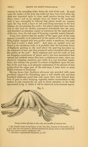 | Keywords: The Quarterly journal of the Geological Society of London (12645214255).jpg 1849 <br> BROWN ON ERECT SIGILLARI <br> 359 <br> stratum in the ascending order forms the roof of the coal In such <br> cases the surface of the peat bog could not have been level when the <br> shale was deposited upon it some small patches having been still <br> above water ; and as no upright trees are found in the sandstone <br> roof it may reasonably be inferred that plants would not vegetate <br> upon the bog itself a layer of soft mud being necessary in the first <br> instance for germinating the seeds ; but when a plant had once taken <br> root in this mud its rootlets penetrated downwards into the peat <br> and furnished an abundant supply of nutriment for the rapid growth <br> of the tree from the rich mass of decaying vegetable matter beneath <br> I may here observe that the quality of the upper part of the seam <br> appears invariably to be influenced by the nature of the roof the coal <br> being highly charged with iron pyrites under a sandstone but quite <br> free from it under a shale roof And since no upright trees are <br> found in the sandstone roofs is it probable that the luxuriant forest <br> of Sigillariae growing in the mud above the peat bog has taken up <br> the sulphuret of iron and thus produced such a beneficial eifect upon <br> the quality of the coal Both sulphuric acid and the oxide of iron <br> are inorganic constituents of plants and it has been ascertained that <br> natural and artificial waters that have a sulphureous taste when em- <br> ployed in irrigating meadows give birth to a very luxuriant vegeta- <br> tion f but whether the growth of a forest of Sigillarise upon the sur- <br> face of the peat bog is an adequate explanation of the absence of iron <br> pyrites from the upper part of the coal seam I must leave to more <br> skilful botanists to determine <br> Having shown that Sigillaria alternans was provided with roots <br> peculiarly adapted for flourishing upon a soft muddy soil and thus <br> furnished additional proof that coal seams have been formed from <br> beds of peat or other decaying vegetable matter accumulated on the <br> surface it only remains for me now to direct attention to the fossil <br> represented in fig 9 which it will be observed in its external aspect <br> Fig 9 <br> Stump broken off close to the root one-tivelfth of natural size <br> Mr Buddie states in the Trans of the Nat Hist Society of Newcastle vol i <br> p 217 that the coal seams in Northumberland are always more or less intermixed <br> with iron pyrites under a sandstone roof <br> t Johnston's Agricultural Chemistry p 273 35269009 109512 51125 Page 359 Text v 5 http //www biodiversitylibrary org/page/35269009 1849 Geological Society of London NameFound Sigillaria alternans Biodiversity Heritage Library The Quarterly journal of the Geological Society of London v 5 1849 Geology Periodicals Smithsonian Libraries bhl page 35269009 dc identifier http //biodiversitylibrary org/page/35269009 smithsonian libraries Information field Flickr posted date ISOdate 2014-02-20 Check categories 2015 August 26 CC-BY-2 0 BioDivLibrary https //flickr com/photos/61021753 N02/12645214255 2015-08-27 10 52 35 cc-by-2 0 PD-old-70-1923 The Quarterly journal of the Geological Society of London 1849 Photos uploaded from Flickr by Fæ using a script |