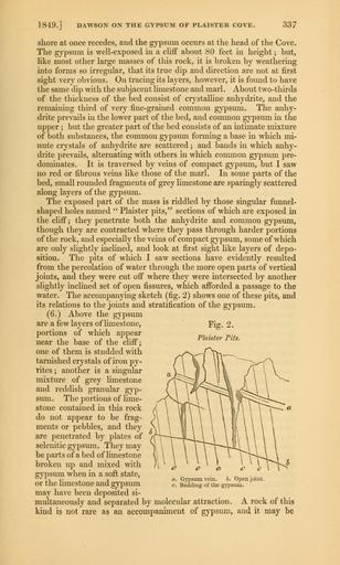 | Keywords: The Quarterly journal of the Geological Society of London (12645678164).jpg 1849 <br> DAWSON ON THE GYPSUM OF PLAISTER COVE <br> 337 <br> shore at once recedes and the gypsum occurs at the head of the Cove <br> The gypsum is well-exposed in a cliff about 80 feet in height ; but <br> like most other large masses of this rock it is broken by weathering <br> into forms so irregular that its true dip and direction are not at first <br> sight very obvious On tracing its layers however it is found to have <br> the same dip with the subjacent limestone and marl About two-thirds <br> of the thickness of the bed consist of crystalline anhydrite and the <br> remaining third of very fine-grained common gypsum The anhy- <br> drite prevails in the lower part of the bed and common gypsum in the <br> upper ; but the greater part of the bed consists of an intimate mixture <br> of both substances the common gypsum forming a base in which mi- <br> nute crystals of anhydrite are scattered ; and bands in which anhy- <br> drite prevails alternating with others in which common gypsum pre- <br> dominates It is traversed by veins of compact gypsum but I saw <br> no red or fibrous veins like those of the marl In some parts of the <br> bed small rounded fragments of grey limestone are sparingly scattered <br> along layers of the gypsum <br> The exposed part of the mass is riddled by those singular funnel- <br> shaped holes named Plaister pits sections of which are exposed in <br> the cliff; they penetrate both the anhydrite and common gypsum <br> though they are contracted where they pass through harder portions <br> of the rock and especially the veins of compact gypsum some of which <br> are only slightly inclined and look at first sight like layers of depo- <br> sition The pits of which I saw sections have evidently resulted <br> from the percolation of water through the more open parts of vertical <br> joints and they were cut off where they were mtersected by another <br> slightly inclined set of open fissures which afforded a passage to the <br> water The accompanying sketch fig 2 shows one of these pits and <br> its relations to the joints and stratification of the gypsum <br> 6 Above the gypsum <br> 2 <br> Fig <br> Plaister Pits <br> are a few layers of limestone <br> portions of which appear <br> near the base of the cliff; <br> one of them is studded with <br> tarnished crystals of iron py- <br> rites ; another is a smgular <br> mixture of grey limestone <br> and reddish granular gyp- <br> sum The portions of lime- <br> stone contained in this rock <br> do not appear to be frag- <br> ments or pebbles and they <br> are penetrated by plates of <br> selenitic gypsum They may <br> be parts of a bed of limestone <br> broken up and mixed with <br> gypsum when in a soft state <br> or the limestone and gypsum <br> may have been deposited si- <br> multaneously and separated by molecular attraction A rock of this <br> kind is not rare as an accompaniment of gypsum and it may be <br> a Gypsum vein b Open joint <br> c Bedding of the gypsum 35268987 109512 51125 Page 337 Text v 5 http //www biodiversitylibrary org/page/35268987 1849 Geological Society of London Biodiversity Heritage Library The Quarterly journal of the Geological Society of London v 5 1849 Geology Periodicals Smithsonian Libraries bhl page 35268987 dc identifier http //biodiversitylibrary org/page/35268987 smithsonian libraries Information field Flickr posted date ISOdate 2014-02-20 Check categories 2015 August 26 CC-BY-2 0 BioDivLibrary https //flickr com/photos/61021753 N02/12645678164 2015-08-27 10 55 55 cc-by-2 0 PD-old-70-1923 The Quarterly journal of the Geological Society of London 1849 Photos uploaded from Flickr by Fæ using a script |