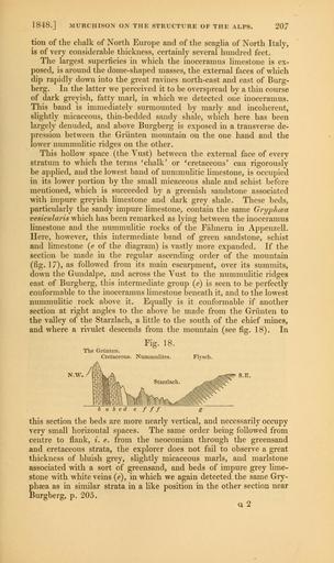 | Keywords: The Quarterly journal of the Geological Society of London (12645631754).jpg 1848 MURCHISON ON THE STRUCTURE OF THE ALPS 207 <br> tion of the chalk of North Europe and of the scagha of North Italy <br> is of very considerable thickness certainly several hundred feet <br> The largest superficies in which the inoceramus limestone is ex- <br> posed is around the dome-shaped masses the external faces of which <br> dip rapidly dowT i into the great ravines north-east and east of Burg- <br> berg In the latter we perceived it to be overspread by a thin course <br> of dark greyish fatty marl in which we detected one inoceramus <br> This band is immediately surmounted by marly and incoherent <br> slightly micaceous thin-bedded sandy shale which here has been <br> largely denuded and above Burgberg is exposed in a transverse de- <br> pression between the Griinten mountain on the one hand and the <br> lower nummulitic ridges on the other <br> This hollow space the Yust between the external face of every <br> stratum to which the terms chalk' or cretaceous' can rigorously <br> be applied and the lowest band of nummulitic limestone is occupied <br> in its lower portion by the small micaceous shale and schist before <br> mentioned which is succeeded by a greenish sandstone associated <br> with impure greyish limestone and dark grey shale These beds <br> particularly the sandy impure limestone contain the same Gryphcea <br> vesicularis which has been remarked as lying between the inoceramus <br> limestone and the nummulitic rocks of the Fahnern in Appenzell <br> Here however this intermediate band of green sandstone schist <br> and limestone e of the diagram is vastly more expanded If the <br> section be made in the regular ascending order of the mountain <br> fig 17 as followed from its main escarpment over its summits <br> down the Gundalpe and across the Vust to the nummulitic ridges <br> east of Burgberg this intermediate group e is seen to be perfectly <br> conformable to the inoceramus limestone beneath it and to the lowest <br> nummulitic rock above it Equally is it conformable if another <br> section at right angles to the above be made from the Griinten to <br> the valley of the Starzlach a little to the south of the chief mines <br> and where a rivulet descends from the mountain see fig 18 In <br> Fig 18 <br> The Griinten <br> Cretaceous Nummulites Flysch <br> Starzlach <br> -;p S E <br> V <br> N <br> babcdefff g <br> this section the beds are more nearly vertical and necessarily occupy <br> very small horizontal spaces The same order being followed from <br> centre to flank i e from the neocomian through the greensand <br> and cretaceous strata the explorer does not fail to observe a great <br> thickness of bluish grey slightly micaceous marls and marlstone <br> associated with a sort of greensand and beds of impure grey lime- <br> stone with white veins e in which we again detected the same Gry- <br> pheea as in similar strata in a like position in the other section near <br> Burgberg p 205 <br> ci2 35268851 109512 51125 Page 207 Text v 5 http //www biodiversitylibrary org/page/35268851 1849 Geological Society of London NameFound Nummulites NameConfirmed Nummulites EOLID 6817785 NameBankID 3399048 Biodiversity Heritage Library The Quarterly journal of the Geological Society of London v 5 1849 Geology Periodicals Smithsonian Libraries bhl page 35268851 dc identifier http //biodiversitylibrary org/page/35268851 smithsonian libraries Information field Flickr posted date ISOdate 2014-02-20 Check categories 2015 August 26 CC-BY-2 0 BioDivLibrary https //flickr com/photos/61021753 N02/12645631754 2015-08-27 10 52 11 cc-by-2 0 PD-old-70-1923 The Quarterly journal of the Geological Society of London 1849 Photos uploaded from Flickr by Fæ using a script |