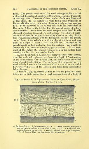 | Keywords: The Quarterly journal of the Geological Society of London (12513123963).jpg 454 <br> PROCEEDINGS OF THE GEOLOGICAL SOCIETY June 19 <br> Road The gravels consisted of the usual subangular flints mixed <br> with rounded quartz and quartzite pebbles with occasional fragments <br> of pudding-stone No traces of river or other shells were discovered <br> in this place In the surface-soil were found some fragments of <br> Romano-British pottery the relics of comparatively modern occupa- <br> tion To the eastward of the railway-station in the foundations of <br> East Acton ViUas on the 60-feet line the ground appeared to have <br> been disturbed Some flakes and small scrapers were found in this <br> place all of surface type and of a dark colour Two chipped imple- <br> ments found here in the gravel are worthy of notice as being of sur- <br> face type although stained with the ferruginous colour of the gravel ; <br> one of these of the celt-form with an edge at the broad end was <br> found at a depth of about 4 feet ; but whether it belonged to the <br> gravel-deposit or had worked in from the surface I was unable to <br> determine ; it is however completely gravel -stained To the west- <br> ward of the station the ground rises as seen by the contour-lines <br> marking the 70- 80- and 90-feet levels <br> In Alfred Road Section B the surface being 63 feetabove the datum <br> a small oval-shaped implement was found at a depth of 7 feet resting <br> on the actual surface of the London Clay and beneath an undisturbed <br> seam of sand 6 inches thick The surface of this implement is very <br> much rolled ; T saw it a few moments after it was taken out and I <br> have preserved a piece of the London Clay taken from immediately <br> below the spot <br> In Section C fig 2 surface 75 feet is seen the position of some <br> flakes and a flint shaped like a rough scraper found at a depth of <br> Fig 2 ” Section C in High-terrace Gravel at Hyde House Shalce- <br> sjjear I oad Surface 75 feet <br> 10 ft <br> a Surface soil 6 in b Disturbed soil 2-3 ft c Gravel and sand ferruginous <br> and irregular with lines of black oxide of iron 1-2 ft d Clay-sand blue <br> grey yellow and red 0-18 in e Gravel and sand with chips' throughout <br> 4 ft / London Clay - - Position of flint implements 34985505 108770 51125 Page 454 Text v 28 http //www biodiversitylibrary org/page/34985505 1872 Geological Society of London Biodiversity Heritage Library The Quarterly journal of the Geological Society of London v 28 1872 Geology Periodicals Smithsonian Libraries bhl page 34985505 dc identifier http //biodiversitylibrary org/page/34985505 smithsonian libraries Information field Flickr posted date ISOdate 2014-02-14 Check categories 2015 August 26 CC-BY-2 0 BioDivLibrary https //flickr com/photos/61021753 N02/12513123963 2015-08-27 10 00 11 cc-by-2 0 PD-old-70-1923 The Quarterly journal of the Geological Society of London 1872 Photos uploaded from Flickr by Fæ using a script |