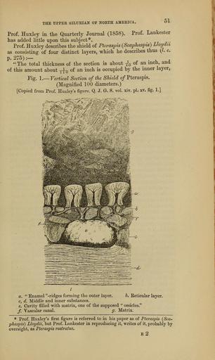 | Keywords: The Quarterly journal of the Geological Society of London (14053245336).jpg THE UPPER SILTTEIAN OF NORTH AMERICA <br> 51 <br> Prof Huxley in tlie Quarterly Journal 1858 Prof Lankester <br> has added little upon this subject <br> Prof Huxley describes the shield of Pterasjns Scapliaspis Lloydn <br> as consisting of four distinct layers which he describes thus I c <br> p 275 ” <br> The total thickness of the section is about q of an inch and <br> of this amount about y - of an inch is occuiDied by the inner layer <br> Pig I ” Vertical Section of the Shield o/Pteraspis <br> Magnified 100 diameters <br> Copied from Prof Huxley's figure Q J G- S vol xiv pi xv fig 1 <br> a Enamel -ridges forming the outer layer b Eeticular layer <br> c d Middle and inner substances <br> e Cavity filled with matrix one of the supposed ossicles <br> / Vascular canal g Matrix <br> Prof Huxley's first figure is referred to in his paper as of Pteraspis Sea- <br> phaspis Lloydii but Prof Lankester in reproducing it writes of it probably by <br> o-versight as Fteraspis rostratus <br> e2 37046889 114009 51125 Page 51 Text 41 http //www biodiversitylibrary org/page/37046889 1885 Geological Society of London NameFound Fteraspis rostratus NameConfirmed Pteraspis rostrata NameFound Pteraspis NameConfirmed Pteraspis EOLID 4655774 NameBankID 4322058 NameFound Scapliaspis Biodiversity Heritage Library The Quarterly journal of the Geological Society of London v 41 1885 Geology Periodicals Smithsonian Libraries bhl page 37046889 dc identifier http //biodiversitylibrary org/page/37046889 smithsonian libraries Information field Flickr posted date ISOdate 2014-04-30 Check categories 2015 August 26 CC-BY-2 0 BioDivLibrary https //flickr com/photos/61021753 N02/14053245336 2015-08-26 04 52 58 cc-by-2 0 PD-old-70-1923 The Quarterly journal of the Geological Society of London 1885 Photos uploaded from Flickr by Fæ using a script |