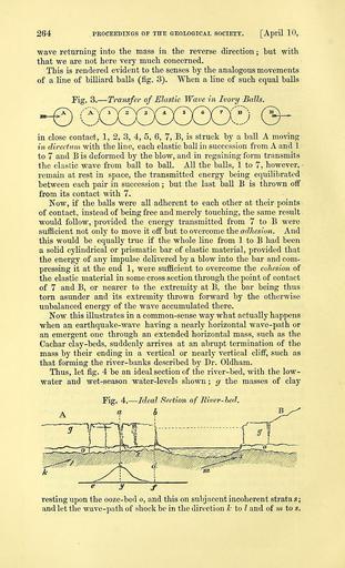 | Keywords: The Quarterly journal of the Geological Society of London (12512912173).jpg 264 <br> PROCEEDINGS OF THE GEOLOGICAL SOCIETY April 10 <br> wave returning into the mass in the reverse direction ; but with <br> that we are not here very much concerned <br> This is rendered evident to the senses by the analogous movements <br> of a line of billiard balls fig 3 When a line of such equal balls <br> Pig 3 ” Transfer of Elastic Wave in Ivory Balls <br> in close contact 1 2 3 4 5 6 7 B is struck by a ball A moving <br> in directum with the line each elastic ball in succession from A and 1 <br> to 7 and B is deformed by the blow and in regaining form transmits <br> the elastic wave from ball to ball All the balls 1 to 7 however ˘ <br> remain at rest in space the transmitted energy being equilibrated <br> between each pair in succession ; but the last ball B is thrown off <br> from its contact with 7 <br> Now if the balls were all adherent to each other at their points <br> of contact instead of being free and merely touching the same result <br> would follow provided the energy transmitted from 7 to B were <br> sufficient not only to move it off but to overcome the adhesion And <br> this would be equally true if the whole line from 1 to B had been <br> a solid cylindrical or prismatic bar of elastic material provided that <br> the energy of any impulse delivered by a blow into the bar and com- <br> pressing it at the end 1 were sufficient to overcome the cohesion of <br> the elastic material in some cross section through the point of contact <br> of 7 and B or nearer to the extremity at B the bar being thus <br> torn asunder and its extremity thrown forward by the otherwise <br> unbalanced energy of the wave accumulated there <br> Now this illustrates in a common-sense way what actually happens <br> when an earthquake-wave having a nearly horizontal wave-path or <br> an emergent one through an extended horizontal mass such as the <br> Cachar clay -beds suddenly arrives at an abrupt termination of the <br> mass by their ending in a vertical or nearly vertical cliff such as <br> that forming the river-banks described by Dr Oldham <br> Thus let fig 4 be an ideal section of the river-bed with the low- <br> water and wet-season water-levels shown ; g the masses of clay <br> Fig 4 ” Ideal Section of Biver-hed <br> resting upon the ooze-bed o and this on subjacent incoherent strata s; <br> and let the wave-path of shock be in the direction Tc to I and of m to s 34985273 108770 51125 Page 264 Text v 28 http //www biodiversitylibrary org/page/34985273 1872 Geological Society of London Biodiversity Heritage Library The Quarterly journal of the Geological Society of London v 28 1872 Geology Periodicals Smithsonian Libraries bhl page 34985273 dc identifier http //biodiversitylibrary org/page/34985273 smithsonian libraries Information field Flickr posted date ISOdate 2014-02-14 Check categories 2015 August 26 CC-BY-2 0 BioDivLibrary https //flickr com/photos/61021753 N02/12512912173 2015-08-27 10 02 41 cc-by-2 0 PD-old-70-1923 The Quarterly journal of the Geological Society of London 1872 Photos uploaded from Flickr by Fæ using a script |