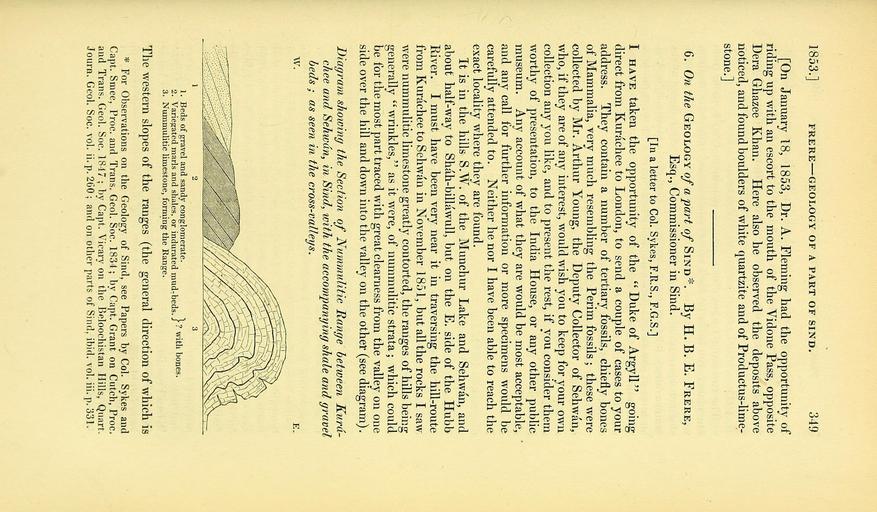 Keywords: The Quarterly journal of the Geological Society of London (12512113463).jpg 1853 FRERE GEOLOGY OF A PART OF SIND 349 <br> On January 18 1853 Dr A Fleming had the opportunity of <br> riding up with an escort to the mouth of the Vidone Pass opposite <br> Dera Ghazee Khan Here also he observed the deposits above <br> noticed and found boulders of white quartzite and of Productus-lime- <br> stone <br> 6 On the Geology of a part of Sind By H B E Frere <br> Esq Commissioner in Sind <br> In a letter to Col Sykes F R S F G S <br> I HAVE taken the opportunity of the Duke of Argyll going <br> direct from Kurachee to London to send a couple of cases to your <br> address They contain a number of tertiary fossils chiefly bones <br> of Mammalia very much resembling the Perim fossils ; these were <br> collected by Mr Arthur Young the Deputy Collector of Sehwan <br> who if they are of any interest would wish you to keep for your own <br> collection any you like and to present the rest if you consider them <br> worthy of presentation to the India House or any other public <br> museum Any account of what they are would be most acceptable <br> and any call for further information or more specimens would be <br> carefully attended to Neither he nor I have been able to reach the <br> exact locality where they are found <br> It is in the hills S W of the Munch ur Lake and Sehwan and <br> about half-way to Shah-billawull but on the E side of the Hubb <br> River I must have been very near it in traversing the hill-route <br> from Kurachee to Sehwan in November 1851 but all the rocks I saw <br> Avere nummulitic limestone greatly contorted the ranges of hills being <br> generally wrinkles as it were of nummulitic strata; which could <br> be for the most part traced with great clearness from the valley on one <br> side over the hill and down into the valley on the other see diagram <br> Diagram showing the Section of Nummulitic Range between Kura- <br> chee and Sehwan i7i Sind with the accompanying shale and gravel <br> beds ; as seen in the cross-valleys <br> \v e <br> 1 Beds of gravel and sandy conglomerate \ ˘ i - <br> 2 Variegated marls and shales or indurated mudrbeds J ' ' <br> 3 Nummulitic limestone forming the Range <br> The western slopes of the ranges the general direction of which is <br> For Observations on the Geology of Sind see Papers by Col Sykes and <br> Capt Smee Proc and Trans Geol Soc 18 34 ; by Capt Grant on Ciitch Proc <br> and Trans Geol Soc 1S47 ; by Capt Vjcary on the Beloochistan Hills Quart <br> Journ Geol Soc vol ii p 260 ; and on other parts of Sind ibid vol iii p 331 34983482 108767 51125 Page 349 Text v 9 http //www biodiversitylibrary org/page/34983482 1853 Geological Society of London NameFound Dera NameConfirmed Dera NameBankID 4139169 NameFound Mammalia NameConfirmed Mammalia EOLID 15503955 NameBankID 2478620 Biodiversity Heritage Library The Quarterly journal of the Geological Society of London v 9 1853 Geology Periodicals Smithsonian Libraries bhl page 34983482 dc identifier http //biodiversitylibrary org/page/34983482 smithsonian libraries Information field Flickr posted date ISOdate 2014-02-14 Check categories 2015 August 26 CC-BY-2 0 BioDivLibrary https //flickr com/photos/61021753 N02/12512113463 2015-08-27 09 51 44 cc-by-2 0 PD-old-70-1923 The Quarterly journal of the Geological Society of London 1853 Photos uploaded from Flickr by FĂŚ using a script |