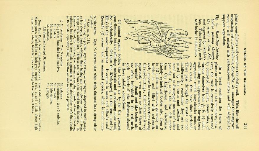| Keywords: The Quarterly journal of the Geological Society of London (12512375234).jpg NELSON ON THE BAHAMAS <br> 211 <br> ing <br> Tubes from - inch <br> to 2 inches in diameter <br> plants consohdates and completes the chalky soil This like the soil <br> originating with Acetabularice Spongillce c amongst the mangrove <br> roots is well mixed with carbonaceous matter and well adapted to <br> support vegetation <br> In a fossil condition the traces of <br> Fig 4 Koot-like tubular plants are obscure ; at some places how- <br> bodies passing through g er the rock is extensively traversed <br> the strata at Cay bal j contorted irregular stony tubes of <br> and exposed by weather- various diameters from yL to l inch <br> exhibiting an appearance of having been <br> aggregated round long slender roots or <br> even stems that have since perished <br> These pass through the strata or not <br> indifferently ; sometimes they are ex- <br> posed by the waves and weather and <br> stand out as disengaged masses of tubes <br> see fig 4 as in the low cliff under <br> Gun Cay Lighthouse and elsewhere <br> Rudely cylindrical bodies also from 9 <br> to 12 inches in diameter generally im- <br> bedded in and filled with red-earth- <br> rock appear in transverse sections along <br> the road-cuttings ; their character is very <br> equivocal even more so than those at <br> Bermuda Small root-like bodies also <br> are often imbedded in the red-earth- <br> rock Nearly all the Bahamas abound <br> in these tubular concretions <br> Of animal organic bodies the Coralsf are by far the greatest <br> contributors both as affording materials and as retaining loose sand <br> c mechanically Of these the MadreporaX in the sense used by <br> Ellis is the most important It occurs in mass and affords sand <br> Zoanthe Z sociata and an unnamed species which is much more <br> cellular fibres Capt N observes that when fresh the moss has a strong odour <br> of iodine <br> Loc cit p 115 <br> t Seas may be prolific says the author in zoophytes dispersed in small groups <br> or low sloping banks without their having any very obvious tendency to form <br> abrupt reefs which last I believe are not now to be found in the Bahamas In <br> Hanover Sound for instance the bottom is a zoophytic garden of most interesting <br> subjects but there is very little appearance of the labyrinthine reefs that obtain <br> in Bermuda especially along its north-east and south-east portions <br> X M cerebrum ; 2 or 3 varieties <br> M porites branched and massive <br> M undata <br> M astraea <br> M rotulosa <br> All abundant except M undata <br> Near East Point New Providence occurs a remarkable accumulation of broken <br> Madrepores imbedded in a dark grey rugged rock at and a httle above high- <br> water mark which however does not belong to the coral-reef basis <br> M galaxsea <br> M muricata ; 2 or 3 varieties <br> M areolata <br> M labyrinthica <br> M phrygia 34983324 108767 51125 Page 211 Text v 9 http //www biodiversitylibrary org/page/34983324 1853 Geological Society of London NameFound M galaxsea NameFound Myriapora areolata NameConfirmed Myriapora EOLID 2953157 NameBankID 267259 NameFound Myriapora astraea NameConfirmed Myriapora EOLID 2953157 NameBankID 267259 NameFound Myriapora cerebrum NameConfirmed Myriapora EOLID 2953157 NameBankID 267259 NameFound Myriapora labyrinthica NameConfirmed Myriapora EOLID 2953157 NameBankID 267259 NameFound Myriapora muricata NameConfirmed Myriapora EOLID 2953157 NameBankID 267259 NameFound Myriapora phrygia NameConfirmed Myriapora EOLID 2953157 NameBankID 267259 NameFound Myriapora porites NameConfirmed Myriapora EOLID 2953157 NameBankID 267259 NameFound Myriapora rotulosa NameConfirmed Myriapora EOLID 2953157 NameBankID 267259 NameFound Myriapora undata NameConfirmed Myriapora EOLID 2953157 NameBankID 267259 NameFound Z sociata Biodiversity Heritage Library The Quarterly journal of the Geological Society of London v 9 1853 Geology Periodicals Smithsonian Libraries bhl page 34983324 dc identifier http //biodiversitylibrary org/page/34983324 smithsonian libraries Information field Flickr posted date ISOdate 2014-02-14 Check categories 2015 August 26 CC-BY-2 0 BioDivLibrary https //flickr com/photos/61021753 N02/12512375234 2015-08-27 09 59 59 cc-by-2 0 PD-old-70-1923 The Quarterly journal of the Geological Society of London 1853 Photos uploaded from Flickr by Fæ using a script |
