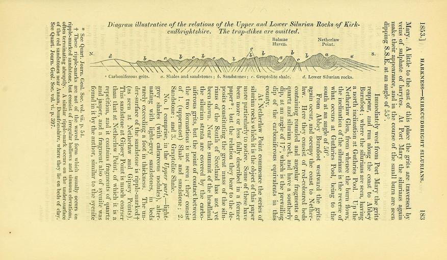 Keywords: The Quarterly journal of the Geological Society of London (12512005023).jpg 1853 <br> HARKNESS KIRKCUDBRIGHT SILURIANS <br> 183 <br> 2 li <br> 3 <br> Mary A little to the east of this place the grits are traversed by <br> veins of sulphate of barytes At Port Mary the Silurians again <br> make their appearance and in the course of the small burn are seen <br> dipping S S E at an angle of 55° <br> Immediately west from Port Mary the grits <br> reappeai' and run along the coast to Abbey <br> Burnfoot ; where the silurians are seen having <br> a north inclination at Guthries Pool Up the <br> Netherlaw Glen from whence the burn flows <br> the inclination of the silurians is the reverse of <br> what occurs at Guthries Pool being to the <br> south at an angle of 50° <br> ' £ From Abbey Burnfoot westward the grits <br> again occur and occupy the coast to Nether- <br> law Here they consist of red-coloured beds <br> containing rounded and angular fragments of <br> quartz and silurian rock and have a southerly <br> dip at an angle of 1 7° which is the prevailing <br> dip of the carboniferous equivalents in this <br> county <br> At Netherlaw Point commence the series of <br> silurian rocks which it is the object of this paper <br> more particularly to notice Some of these have <br> been more or less fully described in a former <br> paper ; but the relation they bear to the de- <br> posits constituting the great mass of the silu- <br> rians of the South of Scotland has not yet <br> been shown Near the summit of the headland <br> the silurian strata are covered by the carbo- <br> niferous grits but the point of contact between <br> the two formations is not seen ; they consist <br> of 1 uppermost Shale and sandstone; 2 <br> Vl Sandstone; and 3 Graptolite Shale <br> No 1 comprise in the Upper part ” light- <br> grey shales with calcareous nodules alter- <br> nating with light-grey sandstones in beds <br> rarely exceeding a foot in thickness The un- <br> der-surface of the sandstone is ripple-markedf <br> as seen at Netherlaw and Gipsey Points <br> This sandstone at Gipsey Point is much coarser <br> than that at Netherlaw Point of which it is a <br> repetition and it contains fragments of quartz <br> and jasper and a fragment also of syenite was <br> found in it by the author similar to the syenite <br> See Quart Joum Geol Soc vol vii p 54 <br> t These ripple-marks are not of the waved form which usually occurs on <br> ripple-marked sandstone but consist of irregular hollows and sinuous elevations <br> often terminating abruptly A similar ripple-mark occurs on the under-surface <br> of the red sandstones near Annan Dumfriesshire where they lie on beds of day <br> See Quart Joum Geol Soc vol vi p 397 <br> 5 <br> y i 34983296 108767 51125 Page 183 Text v 9 http //www biodiversitylibrary org/page/34983296 1853 Geological Society of London Biodiversity Heritage Library The Quarterly journal of the Geological Society of London v 9 1853 Geology Periodicals Smithsonian Libraries bhl page 34983296 dc identifier http //biodiversitylibrary org/page/34983296 smithsonian libraries Information field Flickr posted date ISOdate 2014-02-14 Check categories 2015 August 26 CC-BY-2 0 BioDivLibrary https //flickr com/photos/61021753 N02/12512005023 2015-08-27 09 52 14 cc-by-2 0 PD-old-70-1923 The Quarterly journal of the Geological Society of London 1853 Photos uploaded from Flickr by Fæ using a script |