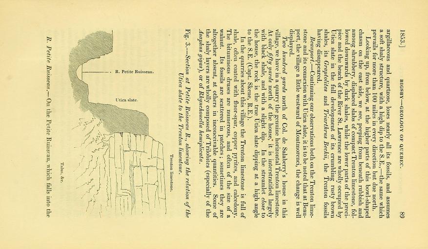 Keywords: The Quarterly journal of the Geological Society of London (12511800315).jpg 1853 <br> BIGSBY GEOLOGY OF aUEBEC <br> 89 <br> argillaceous and quartzose loses nearly all its fossils and assumes <br> a soft shaly structure with a high dip to the S E the same which <br> prevails for more than 100 miles in every direction but due north <br> Looking up from below at the higher parts of this bowl-shaped <br> chasm on the east side we see peeping from beneath rubbish and <br> among shrubbery displaced slabs of compact Trenton limestone fol- <br> lowed downwards by dark shales while the lower parts of the preci- <br> pice and the beach of the River St Lawrence are wholly occupied by <br> Utica slate in the full development of its crumbling rusty brown <br> shales its Graptolites and Triarthrus Beckii the Trenton fossils <br> having disappeared <br> Beauport Continuing our observations both on the Trenton lime- <br> stone and its connexion with Utica slate it is to be noted that at Beau- <br> port the village a little westward of Montmorenci the change is well <br> displayed <br> Two hundred yards north of Col de Salaberry's house in this <br> village we have in a quarry the genuine horizontal Trenton limestone <br> At oxAj ffty yards north of the house ' it is interstratified largely <br> with black shale and with a slight dip In the streamlet close to <br> the house the rock is the true Utica slate dipping at a high angle <br> to the S E Capt Skene R E <br> In the quarries about this village the Trenton limestone is full of <br> shale often coated with fluor-spar copper pyrites and calcedony <br> The bituminous druses are numerous and often of the size of a <br> walnut Its fossils are scattered in patches ; sometimes they are <br> altogether absent at others in inconceivable quantities Some of <br> the shaly layers are wholly composed of Trilobites especially of the <br> Asaphus gigas or oi Rhynchonella hemiplicata <br> Fig 3 Section at Petite Ruisseau R showing the relation of the <br> Utica slate to the Trenton limestone <br> Trenton limestone <br> Talus c <br> R Petite Ruisseau On the Petite Ruisseau Avhich falls into the 34983192 108767 51125 Page 89 Text v 9 http //www biodiversitylibrary org/page/34983192 1853 Geological Society of London NameFound Asaphus gigas NameConfirmed Asaphus I gigas Reed NameFound Graptolites NameConfirmed Graptolites NameBankID 423327 NameFound Rhynchonella NameConfirmed Rhynchonella EOLID 4328553 NameBankID 4331849 NameFound Triarthrus NameConfirmed Triarthrus EOLID 4324679 NameBankID 2875648 Biodiversity Heritage Library The Quarterly journal of the Geological Society of London v 9 1853 Geology Periodicals Smithsonian Libraries bhl page 34983192 dc identifier http //biodiversitylibrary org/page/34983192 smithsonian libraries Information field Flickr posted date ISOdate 2014-02-14 Check categories 2015 August 26 CC-BY-2 0 BioDivLibrary https //flickr com/photos/61021753 N02/12511800315 2015-08-27 10 00 22 cc-by-2 0 PD-old-70-1923 The Quarterly journal of the Geological Society of London 1853 Photos uploaded from Flickr by FĂŚ using a script |