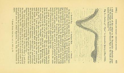 | Keywords: The Quarterly journal of the Geological Society of London (12471641734).jpg 1865 <br> FOSTER AND TOPLEY MEDWAT GRAVELS <br> 455 <br> a full account of this subject to Mr Prestwicli's admirable paper <br> On the Origin of the Sand and Gravel Pipes in the Chalk of the <br> London Tertiary District <br> Fig 5 ” Section of Pipes in Iguanodon Quarry May 1864 <br> a Kentish Eag b Sandgate Beds c Gravel <br> In the case of the pipe shown in fig 5 few persons would hesi- <br> tate to admit that the following was the mode of its formation ” <br> Gravel was deposited on the surface of the Sandgate Beds then rest- <br> ing horizontally on the Kentish Eag ; afterwards part of the Kentish <br> Rag was dissolved away by the percolation of water charged with <br> carbonic acid and the Sandgate Beds and gravel sank down to fill <br> the vacant space In many of the quarries we find every gradation <br> between small pipes and large ones ; and if it is admitted that the <br> small pipes were formed in the manner described above the same <br> mode of formation must be allowed for large ones <br> It seems at first not a little remarkable that where beds have <br> been let down in pipes into limestone they are generally separated <br> from the Kmestone by a bed of clay The only exception of which <br> we are aware is in the case of some pipes in the Magnesian Lime- <br> stone described in the ' Geologist' for 1860 by Mr Kirkby who <br> says p 297 The pipes are found in the limestone beneath the <br> sand beds I have never noticed them where the sand is absent ; <br> and though they are sometimes filled with clay or a mixture of <br> clay and sand yet in these instances a thin layer of sand is always <br> the immediate cover of the limestone ; nevertheless the quarrymen <br> assert that pipes have occurred in other parts of the hill where the <br> limestone is immediately covered by the Boulder Clay <br> The clayey covering of the Chalk claj'-with-flints and also <br> the clay lining the Chalk pipes may be the direct result of chemical <br> action upon the chalk ; but facts about to be described render it at <br> least probable that a horizontal covering of clay whether formed by <br> chemical action or actual deposition may help the formation of <br> pipes <br> Quart Jouvti tcoI i oc rol xi IS' p Gi 34892133 108495 51125 Page 455 Text v 21 http //www biodiversitylibrary org/page/34892133 1865 Geological Society of London NameFound Iguanodon NameConfirmed Iguanodon EOLID 4530741 NameBankID 4204832 Biodiversity Heritage Library The Quarterly journal of the Geological Society of London v 21 1865 Geology Periodicals Smithsonian Libraries bhl page 34892133 dc identifier http //biodiversitylibrary org/page/34892133 smithsonian libraries Information field Flickr posted date ISOdate 2014-02-12 Check categories 2015 August 26 CC-BY-2 0 BioDivLibrary https //flickr com/photos/61021753 N02/12471641734 2015-08-27 09 54 36 cc-by-2 0 PD-old-70-1923 The Quarterly journal of the Geological Society of London 1865 Photos uploaded from Flickr by Fæ using a script |