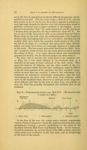 | Keywords: The Quarterly journal of the Geological Society of London (13889134969).jpg  12 <br> PEOF T G BONNET ON THE GEOLOGY <br> sea in the face of a precipitous headland difficult of approach and im- <br> possible to descend The two rocks strike a little S of E and the <br> mica-schist so far as can be seen from above appears to plunge at a <br> very high angle beneath the chloritic rock but not more than would be <br> perfectly consistent with a slight overthrow in the folding As we <br> proceed towards the Tail the strike becomes E and W and about <br> a furlong from the junction the dip is distinctly about 60° N We <br> see no more of the mica-schist until as we proceed from the Tail to <br> Hope village by the path along the northern margin of the headland <br> we note some outcropping beds of it in a cove below ; and then beyond <br> another little cove where the coast-line bends sharply to the north <br> we find in the crags of a headland first mica- schist then chloritic <br> schist and lastly mica-schist all seemingly dipping at a high angle <br> to the south The last-named mica-schist also forms the little look- <br> out headland which divides the two coves between which extends <br> the village of Hope It is rather dark in colour and marvellously <br> gnarled and broken but the foliation-planes are often vertical <br> We have only to traverse the rocky shore in the northern cove <br> at Hope for a very short distance to be convinced that as is <br> indicated in the map we have returned to the slaty series Here <br> again the mimicry of foliation and the other results of the tre- <br> mendous pressure which the beds have undergone make it difficult <br> to fix the exact position of the junction but after repeated exami- <br> nation on more than one occasion I came to the conclusion fully <br> confirmed by subsequent microscopic examination that the beds <br> outcropping on the shore were never more than schistose while <br> those in the headland itself wherever I could get at the crag ren- <br> dered difficult each time by the state of tide were true schists so <br> that the fault has probably determined the northern face of the <br> headland <br> Fig 6 ” Diagrammatic Section near Bolt Tail Horizontal scale <br> 3 inches to 1 mile <br> Headland of <br> Eolt Tail Lifeboat Hope village <br> a Slaty rock <br> b Mica- schist <br> Fault <br> c Chloritic schist <br> In the floor of the cove the newer series exhibits considerable <br> variety of mineral character; but in the crags beyond dark slaty rocks <br> predominate bearing a general resemblance to the series in the <br> headland between Hall Sands and Bossons Sands In the distance <br> beyond Avonmouth the peculiar sheen of the cliffs recalls to mind the <br> satiny slates seen at Slapton on the east coast and at Kingsbridge <br> at the head of the estuary 36940731 113697 51125 Page 12 Text 40 http //www biodiversitylibrary org/page/36940731 1884 Geological Society of London Biodiversity Heritage Library The Quarterly journal of the Geological Society of London v 40 1884 Geology Periodicals Smithsonian Libraries bhl page 36940731 dc identifier http //biodiversitylibrary org/page/36940731 smithsonian libraries Information field Flickr posted date ISOdate 2014-04-30 Check categories 2015 August 26 CC-BY-2 0 BioDivLibrary https //flickr com/photos/61021753 N02/13889134969 2015-08-26 05 51 18 cc-by-2 0 PD-old-70-1923 The Quarterly journal of the Geological Society of London 1884 Photos uploaded from Flickr by Fæ using a script |