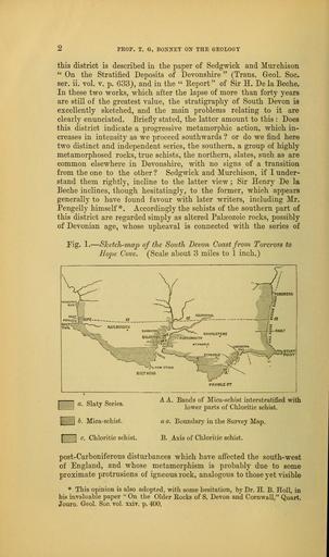 | Keywords: The Quarterly journal of the Geological Society of London (14095804313).jpg 2 PEOF T G BONNET ON THE GEOLOGY <br> this district is described in the paper of Sedgwick and Murchison <br> ' On the Stratified Deposits of Devonshire Trans Geol Soc <br> ser ii vol v p 633 and in the Eeport of Sir H Dela Beche <br> In these two works which after the lapse of more than forty years <br> are still of the greatest value the stratigraphy of Sonth Devon is <br> excellently sketched and the main problems relating to it are <br> clearly enunciated Briefly stated the latter amount to this Does <br> this district indicate a progressive metamorphic action which in- <br> creases in intensity as we proceed southwards or do we find here <br> two distinct and independent series the southern a group of highly <br> metamorphosed rocks true schists the northern slates such as are <br> common elsewhere in Devonshire with no signs of a transition <br> from the one to the other Sedgwick and Murchison if I under- <br> stand them rightly incline to the latter view ; Sir Henry De la <br> Beche inclines though hesitatingly to the former which appears <br> generally to have found favour with later writers including Mr <br> Pengelly himself Accordingly the schists of the southern part of <br> this district are regarded simply as altered Palaeozoic rocks possibly <br> of Devonian age whose upheaval is connected with the series of <br> Pig 1 ” Shetcli-majp of the South Devon Coast from Torcross to <br> Ho;pe Cove Scale about 3 miles to 1 inch <br> a Slaty Series <br> b Mica-schist <br> c Chloritic schist <br> A A Bands of Mica-schist interstratified with <br> lower parts of Chloritic schist <br> a a Boundary in the Survey Map <br> B Axis of Chloritic schist <br> poet-Carboniferous disturbances which have affected the south-west <br> of England and whose metamorphism is probably due to some <br> proximate protrusions of igneous rock analogous to those yet visible <br> This opinion is also adopted with some hesitation by Dr H B Holl in <br> his invaluable paper On the Older Rocks of S Devon and Cornwall Quart <br> Journ Geol Soc vol xxiv p 400 36940771 113697 51125 Page 2 Text 40 http //www biodiversitylibrary org/page/36940771 1884 Geological Society of London Biodiversity Heritage Library The Quarterly journal of the Geological Society of London v 40 1884 Geology Periodicals Smithsonian Libraries bhl page 36940771 dc identifier http //biodiversitylibrary org/page/36940771 smithsonian libraries Information field Flickr posted date ISOdate 2014-04-30 Check categories 2015 August 26 CC-BY-2 0 BioDivLibrary https //flickr com/photos/61021753 N02/14095804313 2015-08-26 05 52 17 cc-by-2 0 PD-old-70-1923 The Quarterly journal of the Geological Society of London 1884 Photos uploaded from Flickr by Fæ using a script |