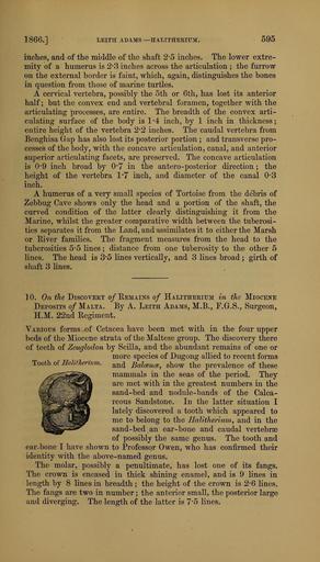 Keywords: The Quarterly journal of the Geological Society of London (13935679172).jpg 1866 LEITTI ADAMS ”HALTTHEETFM 595 <br> inches and of the middle of the shaft 2-5 inches The lower extre- <br> mity of a humerus is 2 3 inches across the articulation ; the furrow <br> on the external border is faint which again distinguishes the bones <br> in question from those of marine turtles <br> A cervical vertebra possibly the 5th or 6th has lost its anterior <br> half; but the convex end and vertebral foramen together with the <br> articulating processes are entire The breadth of the convex arti- <br> culating surface of the body is 1 -4 inch by 1 inch in thickness ; <br> entire height of the vertebra 2'2 inches The caudal vertebra from <br> Benghisa Gap has also lost its posterior portion ; and transverse pro- <br> cesses of the body with the concave articulation canal and anterior <br> superior articulating facets are preserved The concave articulation <br> is 0-9 inch broad by 0 7 in the antero -posterior direction ; the <br> height of the vertebra 1-7 inch and diameter of the canal 0-3 <br> inch <br> A humerus of a very small species of Tortoise from the debris of <br> Zebbug Cave shows only the head and a portion of the shaft the <br> curved condition of the latter clearly distinguishing it from the <br> Marine whilst the greater comparative width between the tuberosi- <br> ties separates it from the Land and assimilates it to either the Marsh <br> or Eiver families The fragment measures from the head to the <br> tuberosities 5 5 lines ; distance from one tuberosity to the other 5 <br> lines The head is 3 5 lines vertically and 3 lines broad ; girth of <br> shaft 3 Hues <br> 0 0 1 the DiscovEKT of Eemains of Halitheeium in the Miocene <br> Deposits of Malta By A Leith Adams M B F G S Surgeon <br> H M 22nd Regiment <br> Yariotjs forms of Cetacea have been met with in the four upper <br> beds of the Miocene strata of the Maltese group The discovery there <br> of teeth of Zeuglodon by Scilla and the abundant remains of one or <br> more species of Dugong allied to recent forms <br> Tooth of Hamerivm j Balcence show the prevalence of these <br> mammals in the seas of the period They <br> are met with in the greatest numbers in the <br> sand-bed and nodule-bands of the Calca- <br> reous Sandstone In the latter situation I <br> lately discovered a tooth which appeared to <br> me to belong to the Halitherium and in the <br> sand-bed an ear-bone and caudal vertebrae <br> of possibly the same genus The tooth and <br> ear-bone I have shown to Professor Owen who has confirmed their <br> identity with the above-named genus <br> The molar possibly a penultimate has lost one of its fangs <br> The crown is encased in thick shining enamel and is 9 lines in <br> length by 8 lines in breadth; the height of the crown is 2-6 lines <br> The fangs are two in number ; the anterior small the posterior large <br> and diverging The length of the latter is 7 5 lines 36165050 111477 51125 Page 595 Text v 22 http //www biodiversitylibrary org/page/36165050 1866 Geological Society of London NameFound Cetacea NameConfirmed Cetacea EOLID 7649 NameBankID 2478494 NameFound Halitheeium NameFound Halitherium NameConfirmed Halitherium EOLID 4469087 NameBankID 4185306 NameFound Scilla NameConfirmed Scilla L EOLID 33607 NameFound Zeuglodon NameConfirmed Zeuglodon EOLID 4525642 NameBankID 4385974 Biodiversity Heritage Library The Quarterly journal of the Geological Society of London v 22 1866 Geology Periodicals Smithsonian Libraries bhl page 36165050 dc identifier http //biodiversitylibrary org/page/36165050 smithsonian libraries Information field Flickr posted date ISOdate 2014-04-21 Check categories 2015 August 26 CC-BY-2 0 BioDivLibrary https //flickr com/photos/61021753 N02/13935679172 2015-08-26 06 51 44 cc-by-2 0 PD-old-70-1923 The Quarterly journal of the Geological Society of London 1866 Photos uploaded from Flickr by Fæ using a script |