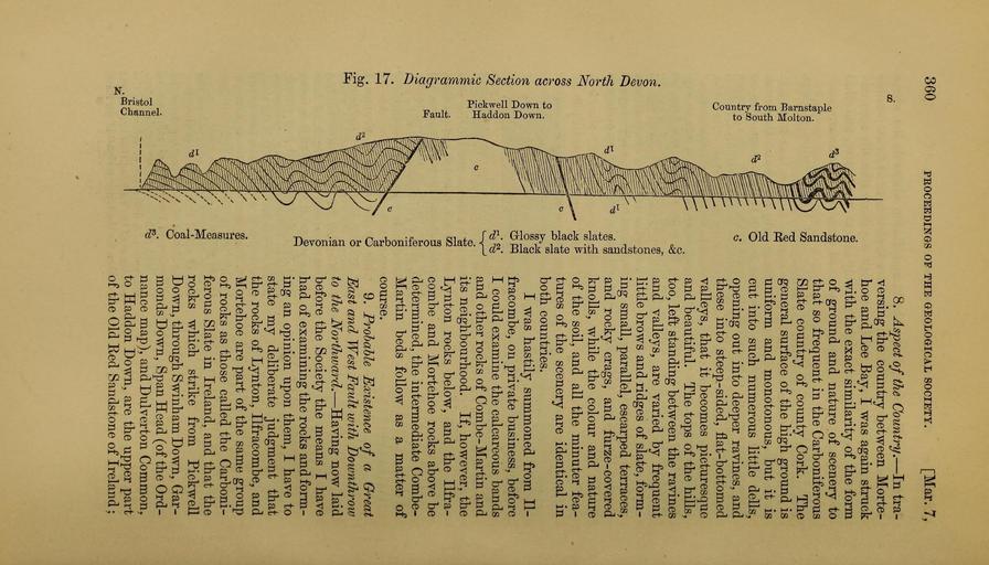 Keywords: The Quarterly journal of the Geological Society of London (13935529512).jpg 360 <br> PROCEEDINGS OF THE GEOLOGICAL SOCIETY Mar 7 <br> e3 o <br> g <br> 6D <br> s <br> li <br> <br> 8 Aspect of the Country ” In tra- <br> versing the country between Morte- <br> hoe and Lee Bay I was again struck <br> with the exact similarity of the form <br> of ground and nature of scenery to <br> that so frequent in the Carboniferous <br> Slate country of county Cork The <br> general surface of the high ground is <br> uniform and monotonous but it is <br> cut into such numerous little dells <br> opening out into deeper ravines and <br> these into steep-sided flat-bottomed <br> valleys that it becomes picturesque <br> and beautiful The tops of the hills <br> too left standing between the ravines <br> and valleys are varied by frequent <br> little brows and ridges of slate form- <br> ing small parallel escarped terraces <br> and rocky crags and furze -covered <br> knolls while the colour and nature <br> of the soil and all the minuter fea- <br> tures of the scenery are identical in <br> both countries <br> I was hastily summoned from II- <br> fracombe on private business before <br> I could examine the calcareous bands <br> and other rocks of Combe-Martin and <br> its neighbourhood If however the <br> Lynton rocks below and the Ilfra- <br> combe and Mortehoe rocks above be <br> determined the intermediate Combe- <br> Martin beds follow as a matter of <br> course <br> 9 Probable Existence of a Great <br> East and West Fault with Downthrow <br> to tlie Northivard ” Having now laid <br> before the Society the means I have <br> had of examining the rocks and form- <br> ing an opinion upon them I have to <br> state my deliberate judgment that <br> the rocks of Lynton Ilfracombe and <br> Mortehoe are part of the same group <br> of rocks as those called the Carboni- <br> ferous Slate in Ireland and that the <br> rocks which strike from Pickwell <br> Down through Swinham Down Gar- <br> monds Down Span Head of the Ord- <br> nance map and Dulverton Common <br> to Haddon Down are the upper part <br> of the Old Red Sandstone of Ireland ; 36164801 111477 51125 Page 360 Text v 22 http //www biodiversitylibrary org/page/36164801 1866 Geological Society of London NameFound Combe NameConfirmed COMBE EOLID 12397 NameBankID 4122786 Biodiversity Heritage Library The Quarterly journal of the Geological Society of London v 22 1866 Geology Periodicals Smithsonian Libraries bhl page 36164801 dc identifier http //biodiversitylibrary org/page/36164801 smithsonian libraries Information field Flickr posted date ISOdate 2014-04-21 Check categories 2015 August 26 CC-BY-2 0 BioDivLibrary https //flickr com/photos/61021753 N02/13935529512 2015-08-26 06 53 02 cc-by-2 0 PD-old-70-1923 The Quarterly journal of the Geological Society of London 1866 Photos uploaded from Flickr by Fæ using a script |