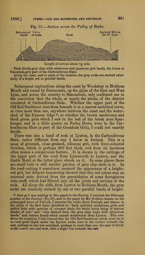 | Keywords: The Quarterly journal of the Geological Society of London (13935509061).jpg 1866 <br> JUKES OLD KED SAITDSTOXE AlfD DBTOIflAIf <br> 361 <br> Fig 11 Section across the Valley of Rocks <br> Eed-stained Valley <br> bands of rocks <br> Eoad <br> Barbrick Mill ott <br> theW Lyne <br> Length of section about 1- mile <br> Dark bluish-grey slate with calcareous and quartzose grit bands the lower or <br> Coomhola-grit part of the Carboniferous Slate <br> Along the coast and in parts of the interior the grey rocks are stained exter- <br> nally of a bright red in parallel bands <br> Subsequent explorations along the coast by Woodabay to Heddons <br> Mouth and round by Parracombe up the glens of the East and West <br> Lyne and across the country to Simonsbath only confirmed me in <br> the conviction that the whole or nearly the whole of the district <br> consisted of Carboniferous Slate Whether the upper part of the <br> Old Eed Sandstone rises from beneath it in a narrow antichnal curve <br> or even more than one anywhere between the coast and the water- <br> shed of the Exmoor ridge or whether the brown sandstones and <br> thick green grits which I saw in the bed of the brook near Spar- <br> hanger and in a little quarry on Farley Down were in the Car- <br> boniferous Slate a part of the Coomhola Grit I could not exactly <br> decide <br> There was also a band of rock at Lynton in the Carboniferous <br> Slate rather different from any I know in Ireland This is a <br> mass of greenish close-grained siliceous grit with liver-coloured <br> blotches which is perhaps 200 feet thick and from its hardness <br> often makes a conspicuous feature It is shown in the cuttings of <br> the upper part of the road from Lynemouth to Lynton and the <br> Castle Hotel at the latter place stands on it In some places there <br> are small beds or still smaller patches of grey clay-slate in it In <br> the road-cutting it sometimes assumed the appearance of a bright- <br> red grit but diligent hammering showed that this red colour was an <br> external stain derived from the peroxidation of some ferruginous <br> vein- stuff which had filtered into all the joints and crevices of the <br> rock All along the chifs from Lynton to Heddons Mouth the grey <br> rocks are similarly stained by one or two parallel bands of bright- <br> Just as I was sending in this paper to the Society I received the February <br> number of the Journal No 85 and in the paper by Mr Grodwin- Austen on the <br> submerged forest of Porlock I perceive the rocks about Porlock and thence to <br> the valley of the East Lyne described as -'hard splintery sandstones grits and <br> pebble beds with partings of compact shale the whole series being of various <br> shades of red and very distinct from the grey slaty rocks with calcareous <br> bands and marine fossils which extend southwards from Lynton This con- <br> firms the suspicion I had formed that the Old Eed Sandstone which must lie at <br> no very great depth under the Lynton rocks rises to the surface towards the <br> east perhaps in one low anticlinal perhaps in more than one the axes of which <br> strike nearly east and west with a slight rise towards the east 36164792 111477 51125 Page 351 Text v 22 http //www biodiversitylibrary org/page/36164792 1866 Geological Society of London Biodiversity Heritage Library The Quarterly journal of the Geological Society of London v 22 1866 Geology Periodicals Smithsonian Libraries bhl page 36164792 dc identifier http //biodiversitylibrary org/page/36164792 smithsonian libraries Information field Flickr posted date ISOdate 2014-04-21 Check categories 2015 August 26 CC-BY-2 0 BioDivLibrary https //flickr com/photos/61021753 N02/13935509061 2015-08-26 06 56 56 cc-by-2 0 PD-old-70-1923 The Quarterly journal of the Geological Society of London 1866 Photos uploaded from Flickr by FĂŚ using a script |