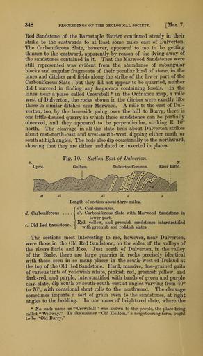 | Keywords: The Quarterly journal of the Geological Society of London (13935497381).jpg 348 <br> PROCEEDINGS OP THE GEOLOGICAL SOCIETY <br> Mar 7 <br> Bed Sandstone of the Barnstaple district continued steady in their <br> strike to the eastwards to at least some miles east of Dulverton <br> The Carboniferous Slate however appeared to me to be getting <br> thinner to the eastward apparently by reason of the dying away of <br> the sandstones contained in it That the Marwood Sandstones were <br> still represented was evident from the abundance of subangular <br> blocks and angular fragments of their peculiar kind of stone in the <br> lanes and ditches and fields along the strike of the lower part of the <br> Carboniferous Slate ; but they did not appear to be quarried neither <br> did I succeed in finding any fragments containing fossils In the <br> lanes near a place called Crewsball in the Ordnance map a mile <br> west of Dulverton the rocks shown in the ditches were exactly like <br> those in similar ditches near Marwood A mile to the east of Dul- <br> verton too by the lane-side going over the hill to Burry there is <br> one little disused quarry in which these sandstones can be partially <br> observed and they appeared to be perpendicular striking E 10° <br> north The cleavage in all the slate beds about Dulverton strikes <br> about east-north-east and west-south-west dipping either north or <br> south at high angles The beds also dip occasionally to the northward <br> showing that they are either undulated or inverted in places <br> Pig 10 ” Section East of Dulverton <br> Upcot <br> Gulham <br> Dulverton Common <br> Length of section about three miles <br> fd Coal-measures <br> d Carboniferous Slate with Marwood Sandstone in <br> lower part <br> /-Mj -o JO A i- fRed yellow and greenish sandstones interstratified <br> c Old Red Sandstone j <br> The sections most interesting to me however near Dulverton <br> were those in the Old Red Sandstone on the sides of the vaUejs of <br> the rivers Barle and Exe Just north of Dulverton in the valley <br> of the Barle there are large quarries in rocks precisely identical <br> with those seen in so many places in the south-west of Ireland at <br> the top of the Old Red Sandstone Hard massive fine-grained grits <br> of various tints of yellowish white pinkish red greenish yellow and <br> dark-red and purple interstratified with bands of green and purple <br> clay-slate dip south or south- south- east at angles varying from 40° <br> to 70° with occasional short roUs to the northward The cleavage <br> sometimes imparts a sort of grain even to the sandstones at right <br> angles to the bedding In one mass of bright-red slate where the <br> No such name as Crewsball was known to the people the place being <br> called Willway In like manner Old HoUom a neighbouring farm ought <br> to be Old Burry 36164789 111477 51125 Page 348 Text v 22 http //www biodiversitylibrary org/page/36164789 1866 Geological Society of London Biodiversity Heritage Library The Quarterly journal of the Geological Society of London v 22 1866 Geology Periodicals Smithsonian Libraries bhl page 36164789 dc identifier http //biodiversitylibrary org/page/36164789 smithsonian libraries Information field Flickr posted date ISOdate 2014-04-21 Check categories 2015 August 26 CC-BY-2 0 BioDivLibrary https //flickr com/photos/61021753 N02/13935497381 2015-08-26 06 51 42 cc-by-2 0 PD-old-70-1923 The Quarterly journal of the Geological Society of London 1866 Photos uploaded from Flickr by Fæ using a script |