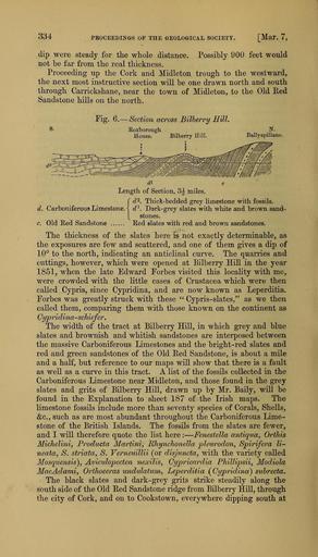 Keywords: The Quarterly journal of the Geological Society of London (13935480461).jpg 334 PROCEEDINGS OF THE GEOLOGICAL SOCIETY Mar 7 <br> dip were steady for the whole distance Possibly 900 feet would <br> not be far from the real thickness <br> Proceeding up the Cork and Midleton trough to the westward <br> the next most instructive section will be one drawn north and south <br> through Carrickshane near the town of Midleton to the Old Eed <br> Sandstone hills on the north <br> Fig 6 ” /Section across Bilberry Hill <br> B Eoxborough <br> House BUberry Hill <br> dl c <br> Length of Section 3 miles <br> d' Thick-bedded grey limestone with fossils <br> d Dark- grey slates with white and brown sand- <br> stones <br> c Old Eed Sandstone Eed slates with red and brown sandstones <br> The thickness of the slates here is not exactly determinable as <br> the exposures are few and scattered and one of them gives a dip of <br> 10° to the north indicating an anticlinal curve The quarries and <br> cuttings however which were opened at Bilberry Hill in the year <br> 1851 when the late Edward Forbes visited this locality with me <br> were crowded with the little eases of Crustacea which were then <br> called Cypris since Cypridina and are now known as Leperditia <br> Forbes was greatly struck with these Cypris-slates as we then <br> called them comparing them with those known on the continent as <br> Gypridina-schiefer <br> The width of the tract at Bilberry Hill in which grey and blue <br> slates and brownish and whitish sandstones are interposed between <br> the massive Carboniferous Limestones and the bright-red slates and <br> red and green sandstones of the Old Red Sandstone is about a mile <br> and a half but reference to our maps will show that there is a fault <br> as well as a curve in this tract A list of the fossils collected in the <br> Carboniferous Limestone near Midleton and those found in the grey <br> slates and grits of Bilberry Hill drawn up by Mr Baily will be <br> found in the Explanation to sheet 187 of the Irish maps The <br> limestone fossils include more than seventy species of Corals Shells <br> c such as are most abundant throughout the Carboniferous Lime- <br> stone of the British Islands The fossils from the slates are fewer <br> and I will therefore quote the list here ” Fenestella antiqua Orthis <br> Michelini Producta Martini Bhynchonella pleurodon Spirifera li- <br> neata S striata 8 VerneuiUii or disju7icta with the variety called <br> Mosquensis Aviculopecten nexilis Cypricardia Phillipsii Modiola <br> MacAdami Orthoceras undulatum Leperditia Cypridina suhrecta <br> The black slates and dark-grey grits strike steadily along the <br> south side of the Old Red Sandstone ridge from Bilberry Hill through <br> the city of Cork and on to Cookstown everywhere dipping south at 36164775 111477 51125 Page 334 Text v 22 http //www biodiversitylibrary org/page/36164775 1866 Geological Society of London NameFound Aviculopecten nexilis NameFound Bhynchonella pleurodon NameConfirmed Rhynchonella pleurodon Phillips NameFound Crustacea NameConfirmed Crustacea EOLID 2598871 NameBankID 2560151 NameFound Cypricardia NameConfirmed Cypricardia NameBankID 4134516 NameFound Cypridina NameConfirmed Cypridina EOLID 13200496 NameBankID 517064 NameFound Cypris NameConfirmed Cypris EOLID 14512 NameBankID 2698202 NameFound Fenestella antiqua NameConfirmed Fenestella antiqua NameFound Leperditia NameConfirmed Leperditia EOLID 13110263 NameBankID 4217023 NameFound Leperditia Cypridina NameConfirmed Leperditia Roualt 1851 NameBankID 4985748 NameFound Michelini NameFound Modiola NameConfirmed Modiola EOLID 71417 NameBankID 2647821 NameFound Mosquensis NameFound Orthis NameConfirmed Orthis EOLID 4333134 NameBankID 4270859 NameFound Orthoceras undulatum NameFound Producta NameConfirmed Producta NameBankID 4310923 NameFound Spirifera NameConfirmed Spirifera NameBankID 4349332 NameFound Spirifera striata NameConfirmed Spirifer striata Biodiversity Heritage Library The Quarterly journal of the Geological Society of London v 22 1866 Geology Periodicals Smithsonian Libraries bhl page 36164775 dc identifier http //biodiversitylibrary org/page/36164775 smithsonian libraries Information field Flickr posted date ISOdate 2014-04-21 Check categories 2015 August 26 CC-BY-2 0 BioDivLibrary https //flickr com/photos/61021753 N02/13935480461 2015-08-26 06 51 34 cc-by-2 0 PD-old-70-1923 The Quarterly journal of the Geological Society of London 1866 Photos uploaded from Flickr by Fæ using a script |