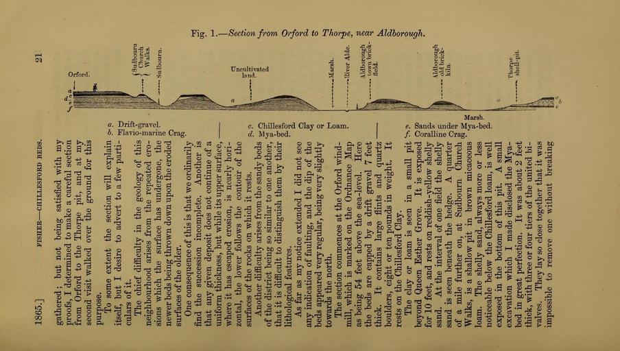 | Keywords: The Quarterly journal of the Geological Society of London (13958352303).jpg 1865 <br> FISHER CHILLESFORD REDS <br> 21 <br> l b <br> i <br> CD <br> gathered; but not being satisfied with my <br> proofs I determined to make a careful section <br> from Orford to the Thorpe pit and at my <br> second visit walked over the ground for this <br> purpose <br> To some extent the section will explain <br> itself but I desire to advert to a few parti- <br> culars of it <br> The chief difficulty in the geology of this <br> neighbourhood arises from the repeated ero- <br> sions which the surface has undergone the <br> newer beds being thrown down upon the eroded <br> surfaces of the older <br> One consequence of this is that we ordinarily <br> find the succession incomplete Another is <br> that any given deposit does not continue of a <br> uniform thickness but while its upper surface <br> where it has escaped erosion is nearly hori- <br> zontal the lower follows the contour of the <br> surfaces of the rocks on which it rests s o <br> Another difficulty arises from the sandy beds q <br> of the district being so similar to one another ' <br> that it is difficult to distinguish them by their <br> lithological features <br> As far as my notice extended I did not see <br> any indication of faulting and the dip of the <br> beds appeared very regular being very slightly <br> towards the north <br> The section commences at the Orford wind- <br> mill which is marked on the Ordnance Map <br> as being 54 feet above the sea-level Here <br> the beds are capped by a drift gravel 7 feet <br> thick It contains large flints and quartz – <br> boulders eight or ten pounds in weight It <br> rests on the Chillesford Clay <br> The clay or loam is seen in a small pit ' <br> beyond Queen Esther Grove It is exposed W <br> for 10 feet and rests on reddish-yeUow sheUy p i <br> sand At the interval of one field the sheUy <br> sand is seen beneath the hedge A quarter <br> of a mile further on at Sudbourn Church <br> Walks is a shallow pit in brown micaceous <br> loam The shelly sand always more or less <br> noticeable below the ChiUesford loam is well <br> exposed in the bottom of this pit A small <br> excavation which I made disclosed the Mya- <br> bed in great perfection It was about 2 feet <br> thick with three or four tiers of the united bi- <br> valves They lay so close together that it was <br> impossible to remove one without breaking <br> CD i-K <br> p <br> a <br> o <br> <br> go <br> B <br> CD tS <br> W 3- <br> CD ˘ <br> Sudboura <br> Church <br> i Walks <br> IL- SuJbourn <br> Marsh <br> TJiver Aide <br> Aldborough <br> town brick- <br> field <br> 5q <br> o <br> f <br> O <br> 4 <br> Aldborough <br> ' old brick- <br> kiln <br> Ttorpe <br> ahell-pit 36164418 111477 51125 Page 21 Text v 22 http //www biodiversitylibrary org/page/36164418 1866 Geological Society of London Biodiversity Heritage Library The Quarterly journal of the Geological Society of London v 22 1866 Geology Periodicals Smithsonian Libraries bhl page 36164418 dc identifier http //biodiversitylibrary org/page/36164418 smithsonian libraries Information field Flickr posted date ISOdate 2014-04-21 Check categories 2015 August 26 CC-BY-2 0 BioDivLibrary https //flickr com/photos/61021753 N02/13958352303 2015-08-26 06 55 17 cc-by-2 0 PD-old-70-1923 The Quarterly journal of the Geological Society of London 1866 Photos uploaded from Flickr by Fæ using a script |