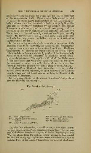 Keywords: The Quarterly journal of the Geological Society of London (13860367334).jpg PROF C LAPWORTH OX THE GIRYAN SUCCESSION <br> bQ\ <br> limestone-yielding conditions for a time into the era of production <br> of the conglomerate itself These nodular beds succeed a patch <br> of calcareous shales Ab 4 representative of the Didymograptus- <br> beds which contain a few characteristic fossils principally Lingulidae <br> This zone is irregularly underlain by the compact and nodular <br> limestones which are exposed in a small side quarry and are <br> especially in their lower portions greatly contorted and shattered <br> The section is terminated below by a series of sandy grits probably <br> those of the lower zones of the O -confinis-beds They afforded me <br> no fossils but they present the hollows and seams of rottenstone <br> characteristic of the zone <br> In the succeeding runnels which cross the prolongation of the <br> limestone band to the eastward the calcareous and conglomeratic <br> groups are shown in a more or less shattered condition The Benan <br> Conglomerate Ac occupies the higher parts of the stream-courses <br> It is underlain in the natural order by patches of the limestone beds <br> which in their turn are supported by fragments of the under- <br> lying sandy gritstones The rapidity with which the higher zones <br> of the limestones part with their calcareous matter as we pass to <br> the eastward is most remarkable the whole of the upper beds <br> showing a tendency to degenerate into a group of nodular shales <br> 2 Craigwells or Brockloch Quarries ” After traversing a short <br> interval devoid of rock-exposures we again meet with the calcareous <br> band in a group of old limestone- quarries lying to the east of the <br> farmhouse of Brockloch <br> In the quarry situated at the disused limekiln of Craigwells we <br> have the following section fig 5 <br> Fig 5 ” Brockloch Quarry <br> N w S E <br> \ <br> Ac Benan Conglomerate <br> Abe Conglomerate with nodules <br> of lime <br> Ab 3 Compact Limestone 20 feet <br> Ab 2 Impure flaggy Limestones <br> Ab 1 Nodular Limestones <br> Aa 2 Calcareous Flagstone <br> To judge from this section it would appear at first sight that the <br> Compact Limestones Ab 3 are surmounted immediately by the basal <br> beds of the Benan Conglomerate Ac while the Didymograpttus-be s <br> Ab 4 are absent from the section having apparently been eroded <br> and that the overlying conglomerate rests unconformably upon an <br> undulated face of the Compact Limestone fragments of which occur 36936396 113692 51125 Page 567 Text 38 http //www biodiversitylibrary org/page/36936396 1882 Geological Society of London NameFound Didymograptus NameConfirmed Didymograptus EOLID 4724756 NameBankID 4143122 NameFound Lingulidae NameConfirmed Lingulidae EOLID 1524 NameBankID 2765652 Biodiversity Heritage Library The Quarterly journal of the Geological Society of London v 38 1882 Geology Periodicals Smithsonian Libraries bhl page 36936396 dc identifier http //biodiversitylibrary org/page/36936396 smithsonian libraries Information field Flickr posted date ISOdate 2014-04-15 Check categories 2015 August 26 CC-BY-2 0 BioDivLibrary https //flickr com/photos/61021753 N02/13860367334 2015-08-26 07 57 28 cc-by-2 0 PD-old-70-1923 The Quarterly journal of the Geological Society of London 1882 Photos uploaded from Flickr by Fæ using a script |