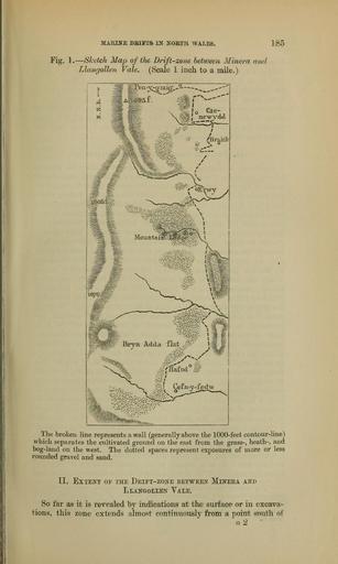 Keywords: The Quarterly journal of the Geological Society of London (13860142194).jpg MARINE DBJETS IN NORTH WALES <br> 185 <br> Fig 1 ” Sketch Map of the Drift-zone between Minera and <br> Llangollen Vale Scale 1 inch to a mile <br> f g e ---- _-' <br> tfo Cae- <br> ˘ ˘ ˘if J ae-wydd <br> i <br> /Braich <br> Hi' ' <br> The broken line represents a wall generally above the 1000-feet contour-line <br> which separates the cultivated ground on the east from the grass- heath- and <br> bog-land on the west The dotted spaces represent exposures of more or less <br> rounded gravel and sand <br> II Extent oe the Drift-zone between Minera and <br> Llangollen Yale <br> So far as it is revealed by indications at the surface or in excava- <br> tions this zone extends almost continuously from a point south of <br> o2 36935960 113692 51125 Page 185 Text 38 http //www biodiversitylibrary org/page/36935960 1882 Geological Society of London Biodiversity Heritage Library The Quarterly journal of the Geological Society of London v 38 1882 Geology Periodicals Smithsonian Libraries bhl page 36935960 dc identifier http //biodiversitylibrary org/page/36935960 smithsonian libraries Information field Flickr posted date ISOdate 2014-04-15 Check categories 2015 August 26 CC-BY-2 0 BioDivLibrary https //flickr com/photos/61021753 N02/13860142194 2015-08-26 07 50 21 cc-by-2 0 PD-old-70-1923 The Quarterly journal of the Geological Society of London 1882 Photos uploaded from Flickr by Fæ using a script