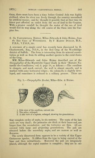 Keywords: The Quarterly journal of the Geological Society of London (13369196113).jpg 1873 <br> DUNCAN CARYOPHYLLIA BREDAI <br> 503 <br> Oxus there must have been a time before Central Asia was highly <br> civilized when the river ran freely through the country unconfined <br> by artificial means ; and he thought it possible that at that time its <br> lower part afforded an outlet from the sea of Aral to the Caspian <br> With a greater rainfall he thought the water of the sea of Aral <br> would find its way along the old course of the Oxus into the Cas- <br> pian Sea <br> 2 On Caryophyllia Bredai Milne-Edwards Jules Haime from <br> the Red Crag of Woodbridge By P Martin Duncan M B <br> F R S V P G S c <br> A specimen of a simple coral has recently been discovered by E <br> Charlesworth Esq F G S in the Red Crag of the Woodbridge <br> district of Suffolk The form is interesting from its mineral consti- <br> tution as well as from its adding another species to the coral-fauna <br> of the Crag <br> MM Milne-Edwards and Jules Haime described one of the <br> Caryophyllia of the Maestricht Upper Chalk in their ' Histoire Na- <br> turelle des Coralliaires ' vol ii page 18 as follows ” The corallum <br> is elongate and much curved ; the wall is almost smooth and is <br> marked with some horizontal ridges ; the columella is slightly deve- <br> loped and sometimes is reduced to a solitary process There are <br> Fig 1 ” Caryophyllia Bredai Milne-Edw Haime <br> 1 2 3 <br> 1 Side view of the corallum natural size <br> 2 The calice enlarged <br> 3 A side view of a septum enlarged showing the granulations <br> four complete cycles of septa in six systems The septa of the last <br> cycle are very small ; the primaries are thick at their inner end are <br> larger than the secondaries ; and the tertiarics are thin All are <br> covered with large and projecting granulations The pali are <br> situated before the secondary septa and are narrow as well as <br> flexuous <br> The newly discovered form appears to be a variety of this Upper <br> Cretaceous species It differs from the type in being curved at the <br> base and then subturbinatc Moreover the pali are irregularly <br> placed although the septal number is complete ; they are in one 39051441 120601 51125 Page 503 Text v 29 http //www biodiversitylibrary org/page/39051441 1873 Geological Society of London NameFound Caryophyllia NameConfirmed Caryophyllia EOLID 11129596 NameBankID 2566615 NameFound Caryophyllia bredai NameConfirmed Caryophyllia bredai Biodiversity Heritage Library The Quarterly journal of the Geological Society of London v 29 1873 Geology Periodicals Smithsonian Libraries bhl page 39051441 dc identifier http //biodiversitylibrary org/page/39051441 smithsonian libraries Information field Flickr posted date ISOdate 2014-03-24 Check categories 2015 August 26 CC-BY-2 0 BioDivLibrary https //flickr com/photos/61021753 N02/13369196113 2015-08-26 10 51 47 cc-by-2 0 PD-old-70-1923 The Quarterly journal of the Geological Society of London 1873 Photos uploaded from Flickr by Fæ using a script |