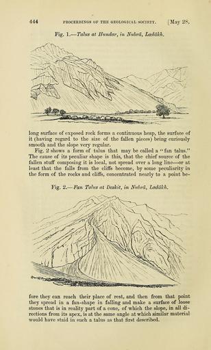 | Keywords: The Quarterly journal of the Geological Society of London (13368997275).jpg 444 PROCEEDINGS OF THE GEOLOGICAL SOCIETY May 28 <br> Fig 1 Talus at Hundar in Nubrd Ladalch <br> long surface of exposed rock forms a continuous heap the surface of <br> it having regard to the size of the fallen pieces being curiously <br> smooth and the slope very regular <br> Fig 2 shows a form of talus that may be called a fan talus <br> The cause of its peculiar shape is this that the chief source of the <br> fallen stuff composing it is local not spread over a long line or at <br> least that the falls from the cliffs become by some peculiarity in <br> the form of the rocks and cliffs concentrated nearly to a point be- <br> Fig 2 Fan Talus at DesTcit in Nubrd LaddkJi <br> fore they can reach their place of rest and then from that point <br> they spread in a fan-shape in falling and make a surface of loose <br> stones that is in reality part of a cone of which the slope in all di- <br> rections from its apex is at the same angle at which similar material <br> would have staid in such a talus as that first described 39051382 120601 51125 Page 444 Text v 29 http //www biodiversitylibrary org/page/39051382 1873 Geological Society of London Biodiversity Heritage Library The Quarterly journal of the Geological Society of London v 29 1873 Geology Periodicals Smithsonian Libraries bhl page 39051382 dc identifier http //biodiversitylibrary org/page/39051382 smithsonian libraries Information field Flickr posted date ISOdate 2014-03-24 Check categories 2015 August 26 CC-BY-2 0 BioDivLibrary https //flickr com/photos/61021753 N02/13368997275 2015-08-26 10 51 22 cc-by-2 0 PD-old-70-1923 The Quarterly journal of the Geological Society of London 1873 Photos uploaded from Flickr by FĂŚ using a script |