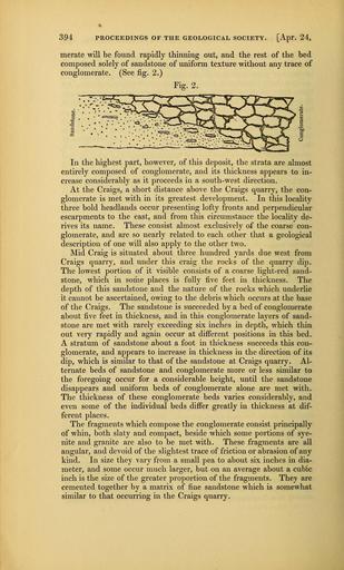 Keywords: The Quarterly journal of the Geological Society of London (13365798124).jpg of one will also apply to the other two <br> Mid Craig is situated about three hundred yards due west from <br> Craigs quarry and under this craig the rocks of the quarry dip <br> The lowest portion of it visible consists of a coarse light-red sand- <br> stone which in some places is fully five feet in thickness The <br> depth of this sandstone and the nature of the rocks which underlie <br> it cannot be ascertained owing to the debris which occurs at the base <br> of the Craigs The sandstone is succeeded by a bed of conglomerate <br> about five feet in thickness and in this conglomerate layers of sand- <br> stone are met with rarely exceeding six inches in depth which thin <br> out very rapidly and again occur at different positions in this bed <br> A stratum of sandstone about a foot in thickness succeeds this con- <br> glomerate and appears to increase in thickness in the direction of its <br> dip which is similar to that of the sandstone at Craigs quarry Al- <br> ternate beds of sandstone and conglomerate more or less similar to <br> the foregoing occur for a considerable height until the sandstone <br> disappears and uniform beds of conglomerate alone are met with <br> The thickness of these conglomerate beds varies considerably and <br> even some of the individual beds differ greatly in thickness at dif- <br> ferent places <br> The fragments which compose the conglomerate consist principally <br> of whin both slaty and compact beside which some portions of sye- <br> nite and granite are also to be met with These fragments are all <br> angular and devoid of the slightest trace of friction or abrasion of any <br> kind In size they vary from a small pea to about six inches in dia- <br> meter and some occur much larger but on an average about a cubic <br> inch is the size of the greater proportion of the fragments They are <br> cemented together by a matrix of fine sandstone which is somewhat <br> similar to that occurring in the Craigs quarry 36934263 113689 51125 Page 394 Text v 6 http //www biodiversitylibrary org/page/36934263 1850 Geological Society of London Biodiversity Heritage Library The Quarterly journal of the Geological Society of London v 6 1850 Geology Periodicals Smithsonian Libraries bhl page 36934263 dc identifier http //biodiversitylibrary org/page/36934263 smithsonian libraries Information field Flickr posted date ISOdate 2014-03-23 Check categories 2015 August 26 CC-BY-2 0 BioDivLibrary https //flickr com/photos/61021753 N02/13365798124 2015-08-26 10 52 52 cc-by-2 0 PD-old-70-1923 The Quarterly journal of the Geological Society of London 1850 Photos uploaded from Flickr by Fæ using a script |