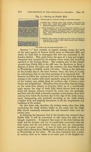 | Keywords: The Quarterly journal of the Geological Society of London (13365232955).jpg 258 PROCEEDINGS OF THE GEOLOGICAL SOCIETY Jan 23 <br> Fig 3 Section at Pebble Hill <br> Ochreous gravel composed chiefly of round flint pebbles <br> London clay; blackish sandy clay passing downwards into <br> brown clay; round flint pebbles and very friable shells <br> dispersed irregularly throughout <br> Coarse ferruginous sand fuU of round flint pebbles 1 to 12 <br> inches in diameter ; some chalk pebbles ; many of the flint <br> pebbles decomposed throughout into a white friable struc- <br> ture This bed frequently passes into an iron sandstone <br> conglomerate <br> d Blottled clays chiefly of a light greenish colour overlying an <br> irregular bed of sand below which succeed other irregular <br> beds of mottled clays <br> The chalk crops out about 6o feet below c <br> Stratum c here contains no organic remains except the teeth <br> of the same species of Lamnce which occur at Clarendon Hill and <br> which we shall find to accompany this hed very constantly in the <br> London district This point forms the apex of a long and roughly <br> triangular area occupied by the tertiary eocene strata and stretching <br> eastward to the German Ocean The southern side of this triangle <br> extends from Pebble Hill to the cliff near the Reculvers in Kent a <br> distance of about 1 00 miles and the northern side from Pebble Hill <br> to Woodbridge in Suffolk nearly 140 miles Owing to the thickness <br> of the London clay in the tract between these two lines it is only <br> by well-sections that we can learn anything of its basement bed If <br> however we follow the outcrop of the beds we shall find this stratum <br> coming to the surface with much regularity along the southern edge <br> of the tertiary area whilst along its northern edge it forms a more <br> broken and irregular line This arises from the tertiary deposits being <br> on the south from Inkpen to Croydon tilted up at a considerable <br> angle against the ridge of chalk hills which throws them out sud- <br> denly and sharply whereas towards the north they rise gradually <br> and form with the chalk a tolerably regularly inclined plane from their <br> outcrop from below the London clay to the edge of the chalk escarp- <br> ment disappearing only gradually according as the chalk attains <br> a higher level and adapting themselves to all the irregularities and <br> variations of the surface <br> On this latter side therefore the tertiary strata often form hills <br> overlooking the chalk district whilst on the south side the chalk <br> hills almost constantly command fine and extensive views over the <br> tertiary area <br> In following the basement bed of the London clay eastward from <br> Pebble Hill it will be convenient to take these two sides of the <br> triangle separately It happens that many of the beds between the <br> chalk and the London clay are of considerable economical value for <br> their sands and tile and pottery clays and they are consequently <br> worked to a great extent A zone of brick and tile fields in fact <br> marks their outcrop from Marlborough to Ewell on the one side and <br> to Woodbridge on the other We are thus furnished with a series <br> of sections such as we obtain in no other part of the English ter- 36934113 113689 51125 Page 258 Text v 6 http //www biodiversitylibrary org/page/36934113 1850 Geological Society of London Biodiversity Heritage Library The Quarterly journal of the Geological Society of London v 6 1850 Geology Periodicals Smithsonian Libraries bhl page 36934113 dc identifier http //biodiversitylibrary org/page/36934113 smithsonian libraries Information field Flickr posted date ISOdate 2014-03-23 Check categories 2015 August 26 CC-BY-2 0 BioDivLibrary https //flickr com/photos/61021753 N02/13365232955 2015-08-26 11 59 32 cc-by-2 0 PD-old-70-1923 The Quarterly journal of the Geological Society of London 1850 Photos uploaded from Flickr by FĂŚ using a script |