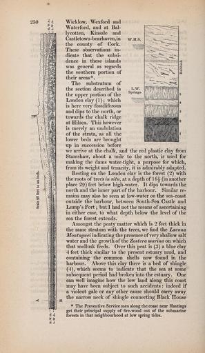 | Keywords: The Quarterly journal of the Geological Society of London (13205959223).jpg 250 <br> V <br> <br> Wicklow Wexford and <br> Waterford and at Bal- <br> lycotten Kinsale and <br> Castletown-bearhaven in <br> the county of Cork <br> These observations in- <br> dicate that the subsi- <br> dence in these islands <br> was general as regards <br> the southern portion of <br> their areas <br> The substratum of <br> the section described is <br> the upper portion of the <br> London clay 1 ; which <br> is here very fossiliferous <br> and dips to the north or <br> towards the chalk ridge <br> at Hilsea This however <br> is merely an undulation <br> of the strata as all the <br> lower beds are brought <br> up in succession before <br> we arrive at the chalk and the red plastic clay from <br> Stamshaw about a mile to the north is used for <br> making the dams water-tight a purpose for which <br> from its weight and tenacity it is admirably adapted <br> Resting on the London clay is the forest 2 with <br> the roots of trees in situ at a depth of 1 6 in another <br> place 29 feet below high-water It dips towards the <br> north and the inner part of the harbour Similar re- <br> mains may also be seen at low-water on the sea-coast <br> outside the harbour between South-Sea Castle and <br> Lump's Fort ; but I had not the means of ascertaining <br> in either case to what depth below the level of the <br> sea the forest extends <br> Amongst the peaty matter which is 2 feet thick in <br> the same stratum with the trees we find the Lacuna <br> Montaguei indicating the presence of very shallow salt <br> water and the growth of the Zostera marina on which <br> that mollusk feeds Over this peat is 3 a blue clay <br> 4 feet thick similar to the present estuary mud and <br> containing the common shells now found in the <br> harbour Above this clay there is a bed of shingle <br> 4 which seems to indicate that the sea at some <br> subsequent period had broken into the estuary One <br> can well imagine how the low land along this coast <br> may have been subject to such accidents indeed if <br> a violent gale or any other cause should carry away <br> the narrow neck of shingle connecting Black House <br> The Preventive Service men along the coast near Hastings <br> get their principal supply of fire-wood out of the submarine <br> forests in that neighbourhood at low spring tides 36932989 113687 51125 Page 250 Text v 3 http //www biodiversitylibrary org/page/36932989 1847 Geological Society of London NameFound Zostera marina NameConfirmed Zostera marina EOLID 1089042 NameBankID 3875217 Biodiversity Heritage Library The Quarterly journal of the Geological Society of London v 3 1847 Geology Periodicals Smithsonian Libraries bhl page 36932989 dc identifier http //biodiversitylibrary org/page/36932989 smithsonian libraries Information field Flickr posted date ISOdate 2014-03-17 Check categories 2015 August 26 CC-BY-2 0 BioDivLibrary https //flickr com/photos/61021753 N02/13205959223 2015-08-26 12 53 43 cc-by-2 0 PD-old-70-1923 The Quarterly journal of the Geological Society of London 1847 Photos uploaded from Flickr by Fæ using a script |