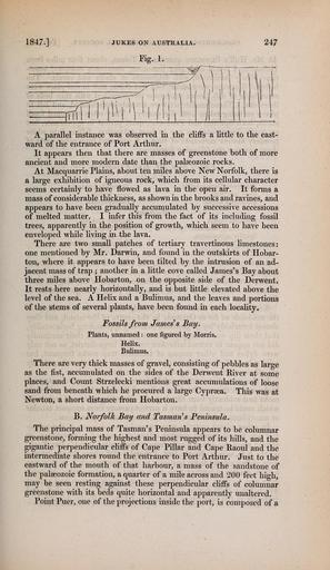 | Keywords: The Quarterly journal of the Geological Society of London (13206129644).jpg 1847 JUKES ON AUSTRALIA 247 <br> Fig 1 <br> fni'ii ivifii i \i <br> A parallel instance was observed in the cliffs a little to the east- <br> ward of the entrance of Port Arthur <br> It appears then that there are masses of greenstone both of more <br> ancient and more modern date than the palaeozoic rocks <br> At Macquarrie Plains about ten miles above New Norfolk there is <br> a large exhibition of igneous rock which from its cellular character <br> seems certainly to have flowed as lava in the open air It forms a <br> mass of considerable thickness as shown in the brooks and ravines and <br> appears to have been gradually accumulated by successive accessions <br> of melted matter I infer this from the fact of its including fossil <br> trees apparently in the position of growth which seem to have been <br> enveloped while living in the lava <br> There are two small patches of tertiary travertinous limestones <br> one mentioned by Mr Darwin and found in the outskirts of Hobar- <br> ton where it appears to have been tilted by the intrusion of an ad- <br> jacent mass of trap ; another in a little cove called James's Bay about <br> three miles above Hobarton on the opposite side of the Derwent <br> It rests here nearly horizontally and is but little elevated above the <br> level of the sea A Helix and a Bulimus and the leaves and portions <br> of the stems of several plants have been found in each locality <br> Fossils from Jameses Bay <br> Plants unnamed one figured by Morris <br> Helix <br> Bulimus <br> There are very thick masses of gravel consisting of pebbles as large <br> as the fist accumulated on the sides of the Derwent River at some <br> places and Count Strzelecki mentions great accumulations of loose <br> sand from beneath which he procured a large Cyprsea This was at <br> Newton a short distance from Hobarton <br> B Norfolk Bay and TasmarHs Peninsula <br> The principal mass of Tasman's Peninsula appears to be columnar <br> greenstone forming the highest and most rugged of its hills and the <br> gigantic perpendicular chffs of Cape Pillar and Cape Baoul and the <br> intermediate shores round the entrance to Port Arthur Just to the <br> eastward of the mouth of that harbour a mass of the sandstone of <br> the palaeozoic formation a quarter of a mile across and 200 feet high <br> may be seen resting against these perpendicular cliffs of columnar <br> greenstone with its beds quite horizontal and apparently unaltered <br> Point Puer one of the projections inside the port is composed of a 36932986 113687 51125 Page 247 Text v 3 http //www biodiversitylibrary org/page/36932986 1847 Geological Society of London NameFound Bulimus NameConfirmed Bulimus EOLID 4890202 NameBankID 4096770 NameFound Puer NameConfirmed Puer EOLID 4129539 NameBankID 4323796 Biodiversity Heritage Library The Quarterly journal of the Geological Society of London v 3 1847 Geology Periodicals Smithsonian Libraries bhl page 36932986 dc identifier http //biodiversitylibrary org/page/36932986 smithsonian libraries Information field Flickr posted date ISOdate 2014-03-17 Check categories 2015 August 26 CC-BY-2 0 BioDivLibrary https //flickr com/photos/61021753 N02/13206129644 2015-08-26 12 51 47 cc-by-2 0 PD-old-70-1923 The Quarterly journal of the Geological Society of London 1847 Photos uploaded from Flickr by Fæ using a script |