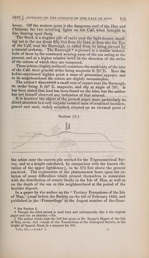 | Keywords: The Quarterly journal of the Geological Society of London (13206077194).jpg 1847 GUMMING ON THE GEOLOGY OF THE CALF OF MAN iFl <br> house Off the western point is the dangerous reef of the Hen and <br> Chickens the two revolving lights on the Calf when brought in <br> line bearing upon them <br> The Stack is a singular pile of rocks near the light-houses stand- <br> ing out in the sea about fifty feet from the land as does also the Eye <br> of the Calf near the Burrough so called from its being pierced by <br> a natural archway The Burrough is pierced in a similar manner <br> both of them by the continued wearing away of the sea acting at the <br> present and at a higher relative level in the direction of the strike <br> of the schists of which they are composed <br> These schists highly inclined constitute the main body of the islet <br> of the Calf their general strike being magnetic S 70° E Near the <br> before-mentioned highest point a mass of greenstone appears and <br> in its neighbourhood the schists are slightly metamorphic <br> The author t discovered a small vein of copper near the Burrough <br> its strike being S 60° E magnetic and dip at angle of 70° It <br> has been stated that lead has been found on the islet but the author <br> has not himself observed any indication of that mineral <br> It is however the object of the present paper more particularly to <br> direct attention to a very singular isolated mass of scratched boulders <br> gravel and sand rudely stratified situated on an elevated point of <br> Section 3 <br> the schist near the eastern pile erected for the Trigonometrical Sur- <br> vey and at a height calculated by comparison with the known ele- <br> vation of the upper lighthouse to be 372 feet above the present <br> sea-level The explanation of the phaenomenon bears upon the so- <br> lution of some difficulties which present themselves in connexion <br> with the distribution of erratic blocks in the Isle of Man as well as <br> on the depth of the sea m this neighbourhood at the period of the <br> boulder deposit <br> In a paper by the author on the Tertiary Formations of the Isle <br> of Man read before the Society on the 4th of February 1846 and <br> published in the 'Proceedings' in the August number of the Quar- <br> See Section 2 <br> t Though the third person is used here and subsequently this is the original <br> paper and not an abstract ” Ed <br> J The author thinks that the 550 feet given in Dr Berger's Report of the Isle <br> of Man in the 2nd volume of the Transactions of the Geological Society as the <br> height of Spanish Head is a mispi'int for 350 <br> VOL III PART I O 36932910 113687 51125 Page 181 Text v 3 http //www biodiversitylibrary org/page/36932910 1847 Geological Society of London Biodiversity Heritage Library The Quarterly journal of the Geological Society of London v 3 1847 Geology Periodicals Smithsonian Libraries bhl page 36932910 dc identifier http //biodiversitylibrary org/page/36932910 smithsonian libraries Information field Flickr posted date ISOdate 2014-03-17 Check categories 2015 August 26 CC-BY-2 0 BioDivLibrary https //flickr com/photos/61021753 N02/13206077194 2015-08-26 12 54 10 cc-by-2 0 PD-old-70-1923 The Quarterly journal of the Geological Society of London 1847 Photos uploaded from Flickr by Fæ using a script |