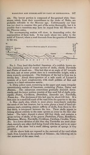 | Keywords: The Quarterly journal of the Geological Society of London (13205693635).jpg HAMILTON AND STRICKLAND ON PART OF CEPHALONIA 107 <br> sist The lowest portion is composed of fine-grained white lime- <br> stones which from their resemblance to the rocks of Malta are <br> probably referable to the Miocene age Unfortunately our time <br> was too short to examine this part of the series thoroughly but it is <br> possible that a transition may here be traced from the Miocene to <br> the Pliocene series <br> The accompanying section will show in descending order the <br> superposition of these beds It was made about two miles to the <br> north of Lixouri where a road descends from the quarries of Schoeno <br> to the sea <br> Village of Section about two miles N of Lixouri <br> Schceno or Quarries <br> Vlicata 17 <br> 16 15 14 13 <br> No I Very hard thin-bedded limestone of a reddish brown co- <br> lour containing casts of recent species of shells chiefly Turritella <br> and Pecten of small size This bed dips at an angle of 50° towards <br> the east and at some points rises to a considerable height with a <br> steep westerly escarpment The thickness of the bed is from ten to <br> twenty feet About three-quarters of a mile north of Lixouri it <br> consists of a hard conglomerate with small pebbles of flint and <br> quartz in a hard calcareous matrix <br> 2 Dirty yellow sand containing in the upper part many irregular <br> concretionary nodules of limestone containing Pecten Ostrea and <br> Anomia The calcareous concretions gradually diminish down- <br> wards and the lower portion consists of fine sand full of shells prin- <br> cipally Pecten Cerithium Dentalium Isocardia cor Turritella <br> Venus c The thickness of this bed may be about 100 feet It is <br> best seen in a small hill south of the road from the quarries to the sea <br> 3 Blue marly clay which in most places immediately underlies <br> the sands of the last stratum but in some places a band of hard cal- <br> careous marl consisting almost enflrely of shells from three to five <br> feet thick is interposed between the two These shells appear to <br> belong almost entirely to the same species as occur in the blue clay <br> below The latter deposit is about 200 feet thick and contains a <br> great variety of shells of the genera Dentalium Fusus Rostellaria <br> Buccinum Murex Turritella Cerithium Cardium Cardita Venus <br> c In a lower division of this blue clay Turritellae are most abun- <br> dant scarcely any other shell being found with them and in an upper <br> portion of the same bed a small oblong species of sponge is very <br> plentiful <br> All the above beds are exposed to the eastward of the road which <br> leads from Lixouri to the quarries of Schceno ; the following are to <br> the westward of the same road 36932836 113687 51125 Page 107 Text v 3 http //www biodiversitylibrary org/page/36932836 1847 Geological Society of London NameFound Buccinum NameConfirmed Buccinum EOLID 10712522 NameBankID 2685510 NameFound Cardita NameConfirmed Cardita EOLID 57589 NameBankID 2693146 NameFound Cardium NameConfirmed Cardium EOLID 50301 NameBankID 2693257 NameFound Cephalonia NameConfirmed Cephalonia NameBankID 4106720 NameFound Cerithium NameConfirmed Cerithium EOLID 10714569 NameBankID 2684349 NameFound Dentalium NameConfirmed Dentalium EOLID 10722796 NameBankID 2694593 NameFound Fusus NameConfirmed Fusus EOLID 2988518 NameBankID 4173880 NameFound Isocardia NameConfirmed Isocardia EOLID 4759043 NameBankID 4207414 NameFound Murex NameConfirmed Murex EOLID 10713648 NameBankID 2685236 NameFound Ostrea NameConfirmed Ostrea EOLID 10719983 NameBankID 2692450 NameFound Pecten NameConfirmed Pecten EOLID 10719936 NameBankID 2692292 NameFound Rostellaria NameConfirmed Rostellaria EOLID 4873050 NameBankID 3940657 NameFound Turritella NameConfirmed Turritella EOLID 52187 NameBankID 2683895 Biodiversity Heritage Library The Quarterly journal of the Geological Society of London v 3 1847 Geology Periodicals Smithsonian Libraries bhl page 36932836 dc identifier http //biodiversitylibrary org/page/36932836 smithsonian libraries Information field Flickr posted date ISOdate 2014-03-17 Check categories 2015 August 26 CC-BY-2 0 BioDivLibrary https //flickr com/photos/61021753 N02/13205693635 2015-08-26 12 50 15 cc-by-2 0 PD-old-70-1923 The Quarterly journal of the Geological Society of London 1847 Photos uploaded from Flickr by Fæ using a script |