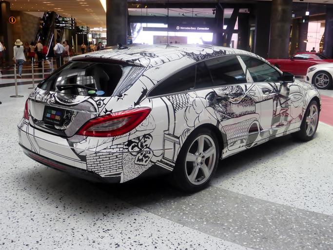 | Keywords: The rearview of Mercedes-Benz CLS350 Shooting Brake (X218) Art Car.JPG  ja X218型メルセデス・ベンツCLS350シューティングブレークのアートカーをリアから撮影  2014-07-17 14 34 38 own Tokumeigakarinoaoshima 100px100px cc-zero Art cars Uploaded with UploadWizard Mercedes-Benz X218 2012 |