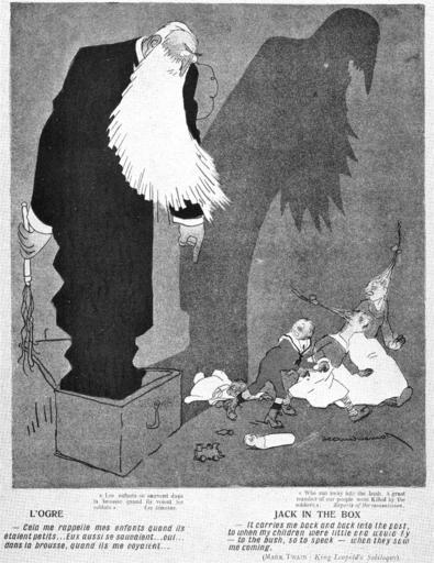 Keywords: The Royal Jack in the Box.jpg « Les enfants se sauvent dans la brousse quand ils voient les soldats » Les témoins L'OGRE ” Cela me rappelle mes enfants quand ils étaient petits Eux aussi se sauvaient oui dans la brousse quand ils me voyaient old cartoon of the King Leopold II of Belgium PD-old Leopold II of Belgium Jack-in-the-box |