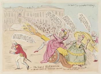 | Keywords: The siege of Blenheim - or - the new system of gunning, discoverd by James Gillray.jpg en The seige of Blenheim - or - the new system of gunning discoverd by James Gillray died 1815 published 1791 See source website for additional information This set of images was gathered by User Dcoetzee from the National Portrait Gallery London website using a special tool All images in this batch have been confirmed as author died before 1939 according to the official death date listed by the NPG en The image contains the following text top middle BLENHEIM top right Pub<sup>d</sup> March 5<sup>th</sup> 1791 by H Humphrey N<sup>o</sup> 18 Old Bond St letters shot out by cannon <poem>Love Letter</poem> <poem>forged Love Letter</poem> <poem>Letter from Marq of Blan written by myself</poem> <poem>Letter written by my Daddy</poem> <poem>Letter forged by my Mother</poem> <poem>Letter forged by myself</poem> <poem>Letters in Answer to my self</poem> spoken by Elizabeth Gunning straddling cannon middle <poem>O Mother Mother my mask'd Battery is dis- -covered we shall be blown up - O Mother Mother we must raise the Siege immediately take refuge under the Ducheſs's cover'd way there act on the defensive O Mother Mother it's all your fault say what you will </poem> Mrs Gunning <poem>Good Heavins who could have thought that the seige of a Coronet would have ended in smoke stink - well I'll take my <u>affidavit</u> that I know nothing at all about the matter </poem> Duchess of Bedford <poem>Come under my Protection deary's I'll hide you in Bedfordshire; find one of my little Grannny-boys to play with Miſsy </poem> man at left <poem>I find our Strategem won't take effect therefore I'll be off; menoeuvre; - any common Soldier can lead on to an attack but it requires a <u>General</u> to bring off his forces with honor after a defeat </poem> caption below picture <poem>The Seige of BLENHEIM or - the new system of <u>GUNNING</u> discoverd dedicated to the Duke of A_ Vide _ A bold stroke for a Husband _ </poem> D13002 1791 Creator James Gillray PD-old-100 Notes http //members fortunecity com/chtii/irish/coot/gunning htm Gunning family - scandal details <references /> National Portrait Gallery London James Gillray Gunning caricatures Cannons in painting Flatulence in art Art forgery |