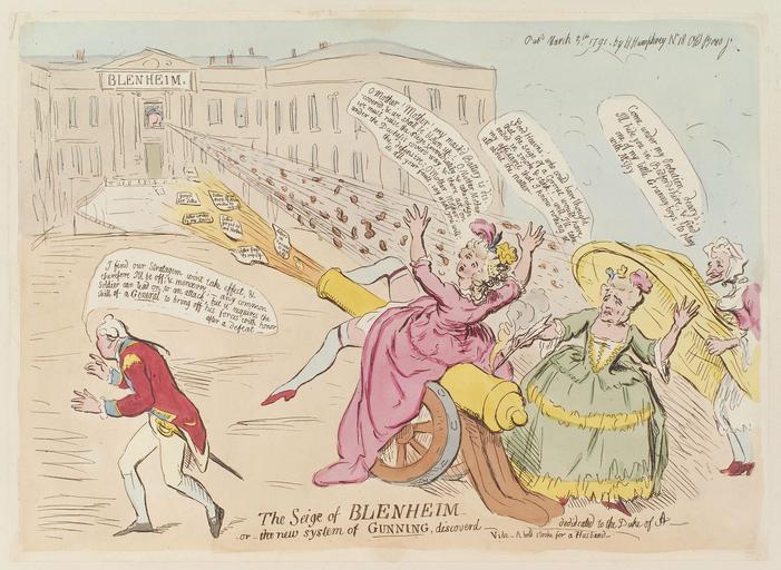 Keywords: The siege of Blenheim - or - the new system of gunning, discoverd by James Gillray.jpg en The seige of Blenheim - or - the new system of gunning discoverd by James Gillray died 1815 published 1791 See source website for additional information This set of images was gathered by User Dcoetzee from the National Portrait Gallery London website using a special tool All images in this batch have been confirmed as author died before 1939 according to the official death date listed by the NPG en The image contains the following text top middle BLENHEIM top right Pub<sup>d</sup> March 5<sup>th</sup> 1791 by H Humphrey N<sup>o</sup> 18 Old Bond St letters shot out by cannon <poem>Love Letter</poem> <poem>forged Love Letter</poem> <poem>Letter from Marq of Blan written by myself</poem> <poem>Letter written by my Daddy</poem> <poem>Letter forged by my Mother</poem> <poem>Letter forged by myself</poem> <poem>Letters in Answer to my self</poem> spoken by Elizabeth Gunning straddling cannon middle <poem>O Mother Mother my mask'd Battery is dis- -covered we shall be blown up - O Mother Mother we must raise the Siege immediately take refuge under the Ducheſs's cover'd way there act on the defensive O Mother Mother it's all your fault say what you will </poem> Mrs Gunning <poem>Good Heavins who could have thought that the seige of a Coronet would have ended in smoke stink - well I'll take my <u>affidavit</u> that I know nothing at all about the matter </poem> Duchess of Bedford <poem>Come under my Protection deary's I'll hide you in Bedfordshire; find one of my little Grannny-boys to play with Miſsy </poem> man at left <poem>I find our Strategem won't take effect therefore I'll be off; menoeuvre; - any common Soldier can lead on to an attack but it requires a <u>General</u> to bring off his forces with honor after a defeat </poem> caption below picture <poem>The Seige of BLENHEIM or - the new system of <u>GUNNING</u> discoverd dedicated to the Duke of A_ Vide _ A bold stroke for a Husband _ </poem> D13002 1791 Creator James Gillray PD-old-100 Notes http //members fortunecity com/chtii/irish/coot/gunning htm Gunning family - scandal details <references /> National Portrait Gallery London James Gillray Gunning caricatures Cannons in painting Flatulence in art Art forgery |