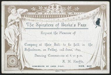 | Keywords: text writing document drawing photo border Invitation card to a ball. The name of the invitee is not filled in. The border incorporates the figure of a woman holding up the announcement, and there is a black cat sitting on a new moon in the top right corner. Quantity: 1 colour art print(s). Physical Description: Engraving, on card 77 x 115 mm. Provenance: Purchased in 2005. Timaru herald (Newspaper). The Spinsters of Burke's Pass request the pleasure of ...... company at their ball, to be held in the Schoolroom, on Friday, 2nd June, 1899. Dancing commences at 8.30 p.m. A M Keeffe, Hon. Sec. Herald Print [1899]. Ref: Eph-A-BALL-1899-01. Alexander Turnbull Library, Wellington, New Zealand. natlib.govt.nz/records/23036567 Invitation card to a ball. The name of the invitee is not filled in. The border incorporates the figure of a woman holding up the announcement, and there is a black cat sitting on a new moon in the top right corner. Quantity: 1 colour art print(s). Physical Description: Engraving, on card 77 x 115 mm. Provenance: Purchased in 2005. Timaru herald (Newspaper). The Spinsters of Burke's Pass request the pleasure of ...... company at their ball, to be held in the Schoolroom, on Friday, 2nd June, 1899. Dancing commences at 8.30 p.m. A M Keeffe, Hon. Sec. Herald Print [1899]. Ref: Eph-A-BALL-1899-01. Alexander Turnbull Library, Wellington, New Zealand. natlib.govt.nz/records/23036567 |
