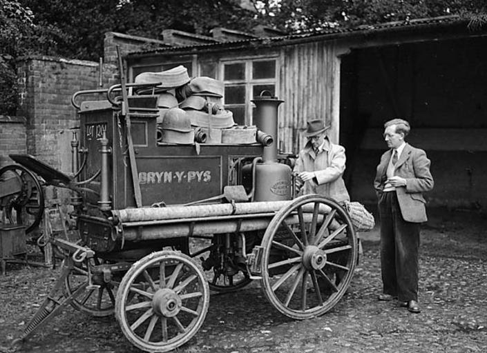 <b>Nodyn/Note:</b> Image of an old horse-drawn fire engine being examined by two men. After the death of Major Hugh Peel in 1950 the Bryn-y-Pys mansion was let and a large proportion of its contents sold.