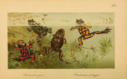 | Keywords: The tailless batrachians of Europe (6216966039).jpg 144 DISCOGLOSSIDJ <br> Grey olive or rarely bright grass-green above with <br> distant symmetrical blackish or dark bottle-green <br> spots disposed on the larger warts Usually in Grerman <br> specimens a pair of pale green or bright green roundish <br> spots between the shoulders Austrian specimens <br> often lack the green colour and Mehely found it in <br> two specimens only out of fifty collected in Hungary <br> A dark streak from the end of the snout to the eye ; <br> upper lip with dark vertical bars ; limbs including <br> the digits with more or less regular dark cross-bars <br> Lower parts bluish-black usually with white dots <br> and more or less numerous insuliform or vermicular <br> bright orange to vermilion markings the most con- <br> stant of which are a pair of pectoral spots and a pair <br> of lumbar cross-bars the latter sometimes nearlv <br> continuous like a belt across the praepubic region ; the <br> spots sometimes absent on the throat and belly which <br> then are entirely black dotted with white ; a small <br> white spot sometimes present on the chin A large <br> bright spot on the inner side of the palmar and <br> another on the inner side of the plantar surface; <br> these spots are not confluent with those on the <br> forearm and tarsus and do not extend to the tip of <br> the inner digit ; one specimen from Vienna is excep- <br> tional in having the plantar and tarsal spots confluent <br> on the right side The tips of all the digits black or <br> yellowish-white never bright orange or red <br> Iris golden much sprinkled over with brown or <br> bronzy brown with a golden circle round the pupil ; <br> the golden border broader above than below and at <br> the sides ; the pupil round with a lower angle or sub- <br> triangular rarely notched above as in the following <br> species ” in fact perfectly similar to that oiDiscoglossus <br> Male distinguished from the female by a usually <br> somewhat shorter body a rather broader head <br> stronger fore limbs and especially by the presence of <br> a pair of internal vocal sacs formed by the skin of the <br> floor of the mouth which is loose and plicate and <br> projects through a slit dividing the submaxillary 36107831 111303 52023 Blank 1 http //www biodiversitylibrary org/page/36107831 1897 10 5962/bhl title 52023 Boulenger George Albert Biodiversity Heritage Library The tailless batrachians of Europe v 1 Amphibians Europe Frogs SIL Smithsonian Institution Libraries bhl page 36107831 dc identifier http //biodiversitylibrary org/page/36107831 Taxonomy Order Anura sil smithsonian institution libraries taxonomy order anura Information field Flickr posted date ISOdate 2011-10-06 CC-BY-2 0 BioDivLibrary https //flickr com/photos/61021753 N02/6216966039 2015-09-01 06 20 25 cc-by-2 0 PD-old-70-1923 Frogs in art The tailless batrachians of Europe Photos uploaded from Flickr by Fæ using a script |